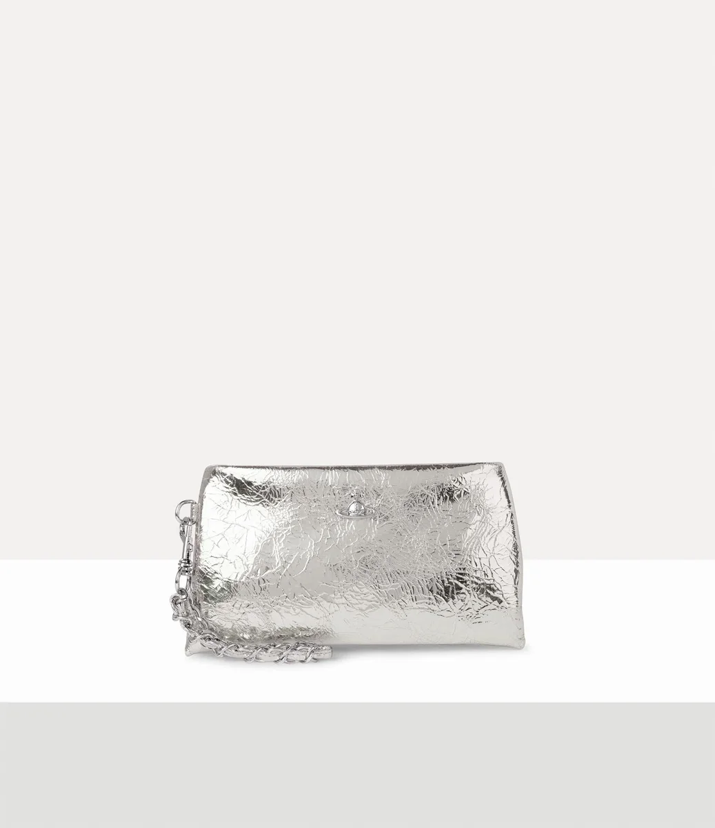 Die Sadie-Handgelenktasche wurde aus metallischem Leder mit Knittereffekt neu interpretiert, inspiriert vom reichhaltigen Archiv des Hauses. Das Design zeichnet sich durch eine silberfarbene Kette aus, die mit farblich abgestimmten Lederdetails verwoben ist und vorne mit einem polierten Kugelmotiv verziert ist – ein Synonym für Viviennes Vision, Tradition in die Zukunft zu tragen.