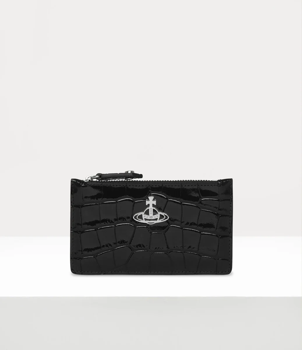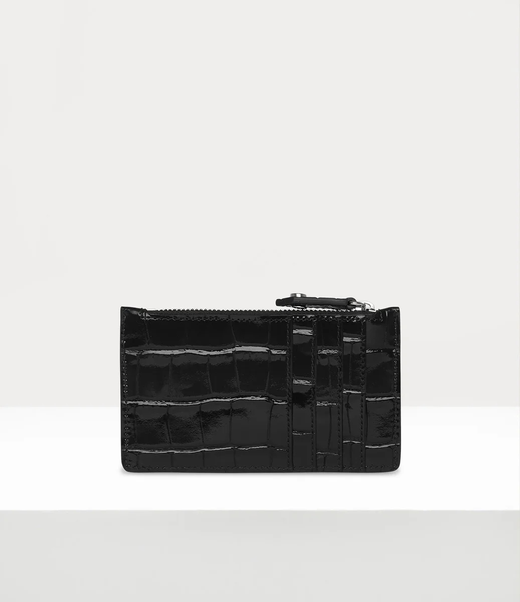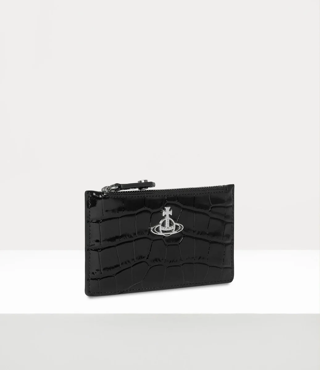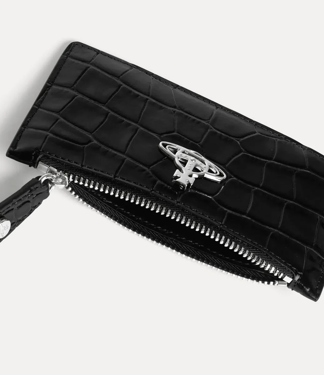 Der Slim Long Kartenhalter ist aus Leder mit Krokodilprägung gefertigt und verfügt über einen gravierten Reißverschluss, vier Kartenfächer auf der Rückseite und eine gefütterte Version unseres Orb-Motivs auf der Vorderseite in Silbertönen.