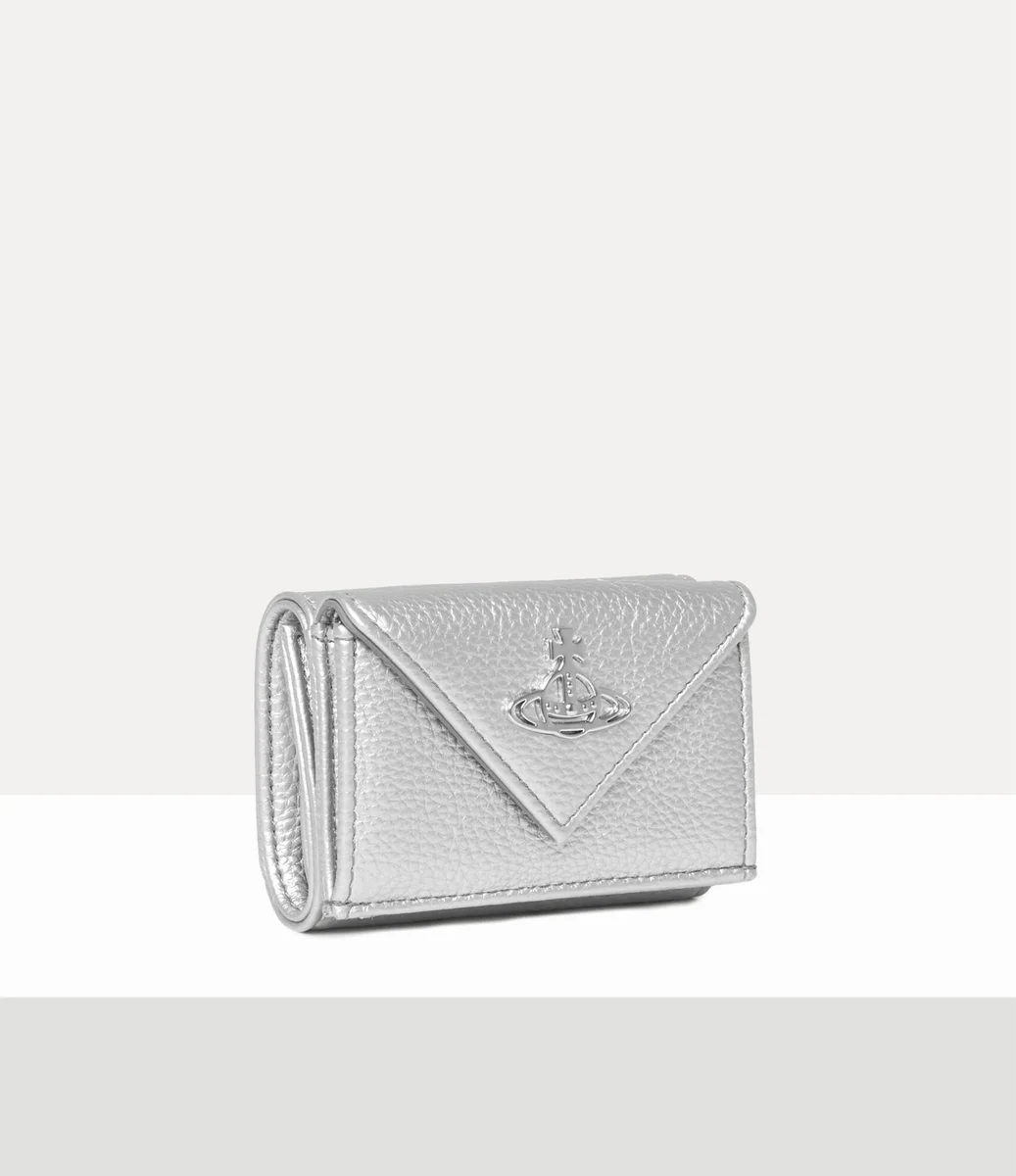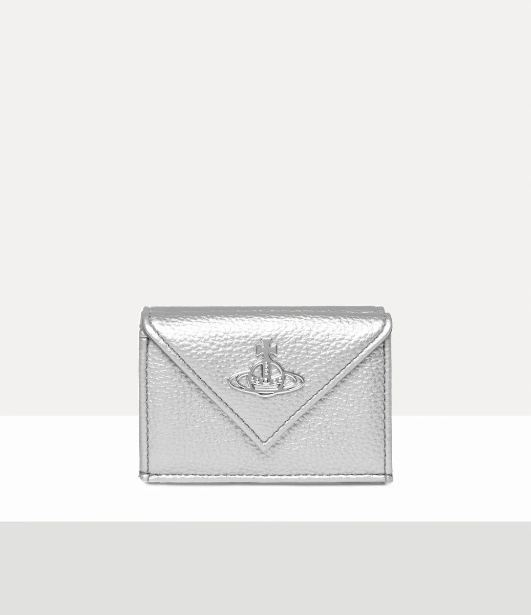 Unsere Envelope Billfold hat eine silberne PU-Silhouette, die mit dem körnigen Finish dieser Saison geprägt ist. Das Design zeigt das charakteristische „Line Orb”-Motiv des Hauses auf dem Druckknopfverschluss und verkörpert Viviennes Vision, Tradition in die Zukunft zu tragen.