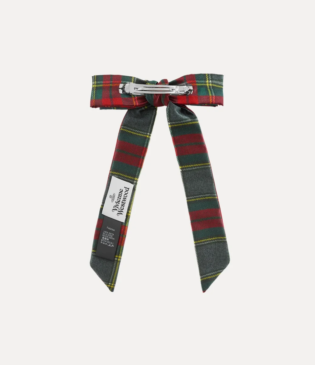 Die Haarspange Flyes zeichnet sich durch eine überdimensionale, schleifenförmige Silhouette aus, die mit dem Tartan-Motiv „Scarlet” verziert ist. Das mehrschichtige Schleifendesign ist von Hand mit einer klassischen Kugelstickerei aus mehrfarbigem Garn veredelt und spiegelt die Philosophie des Hauses wider, Vergangenheit und Zukunft miteinander zu verbinden.