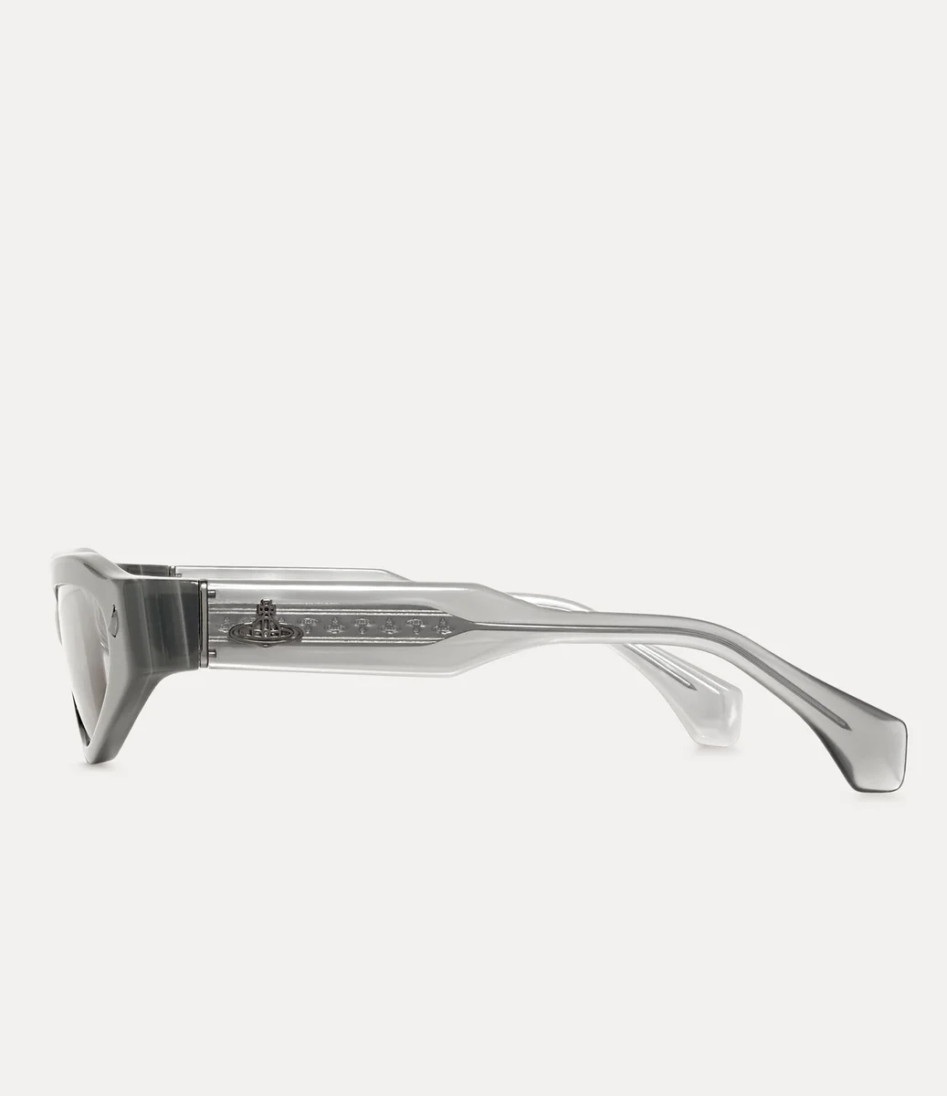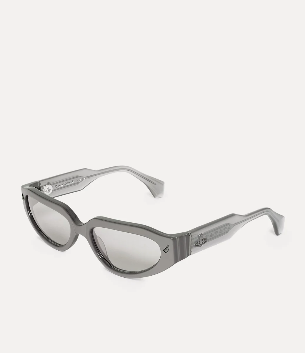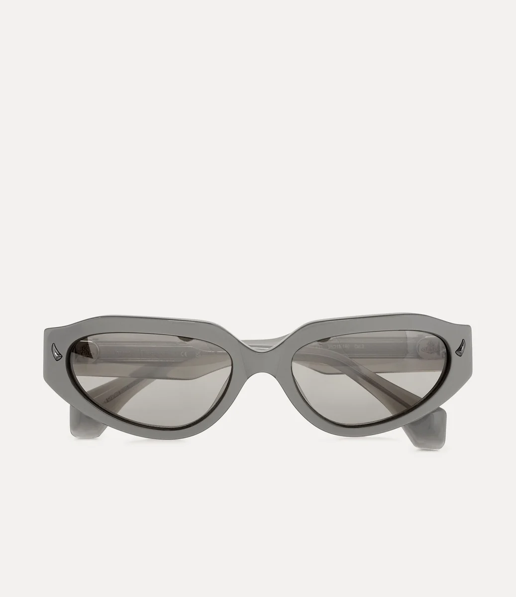 Die Grace Sonnenbrille hat eine vintage-inspirierte ovale Silhouette, die sich durch einen markanten, sanft ausgestellten Außenrand auszeichnet und vom Glamour und den zeitlosen Ikonen des Studio 54 inspiriert ist. Das Design in glänzendem Silber wird durch getönte Gläser und hornförmige Verzierungen am Außenrand aufgewertet – eine Hommage an Viviennes ikonisches Horn-Alice-Band.