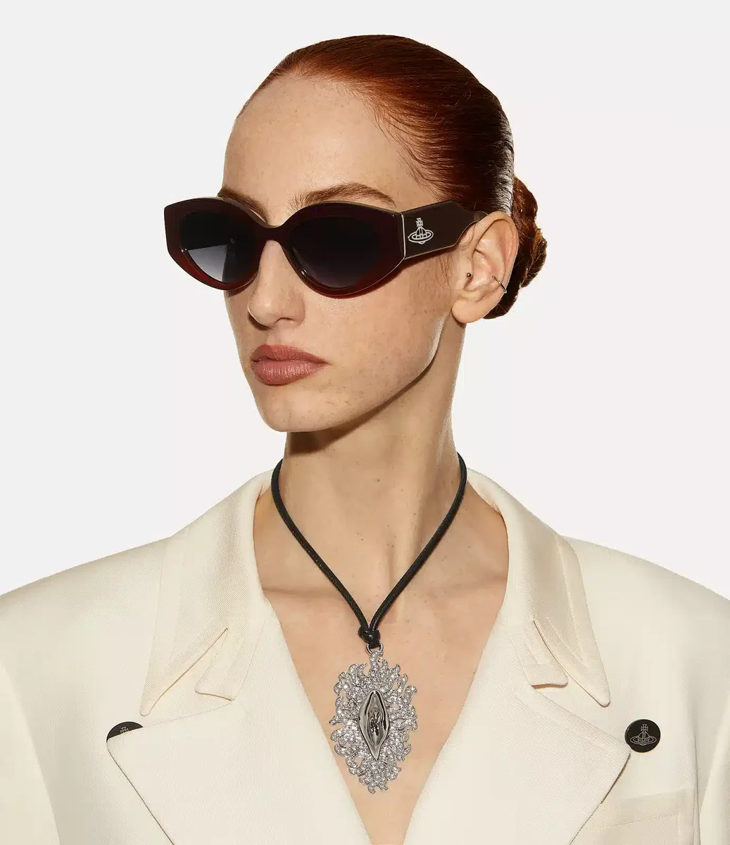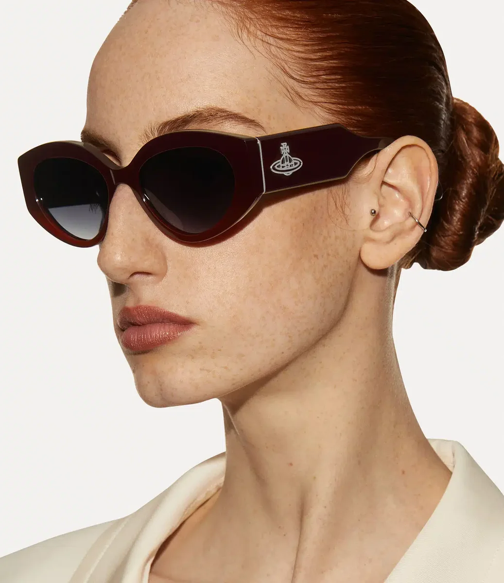 Die Jackie-Sonnenbrille zeichnet sich durch eine zeitlose Silhouette aus, die von Vintage-Fotografien und Underground-Ikonen der 1980er Jahre inspiriert ist. Das Modell verfügt über UV-schützende Gläser mit Farbverlauf und wird durch eine zweidimensionale Metallkugel an den Bügeln abgerundet, die Viviennes Vision verkörpert, Tradition in die Zukunft zu tragen.