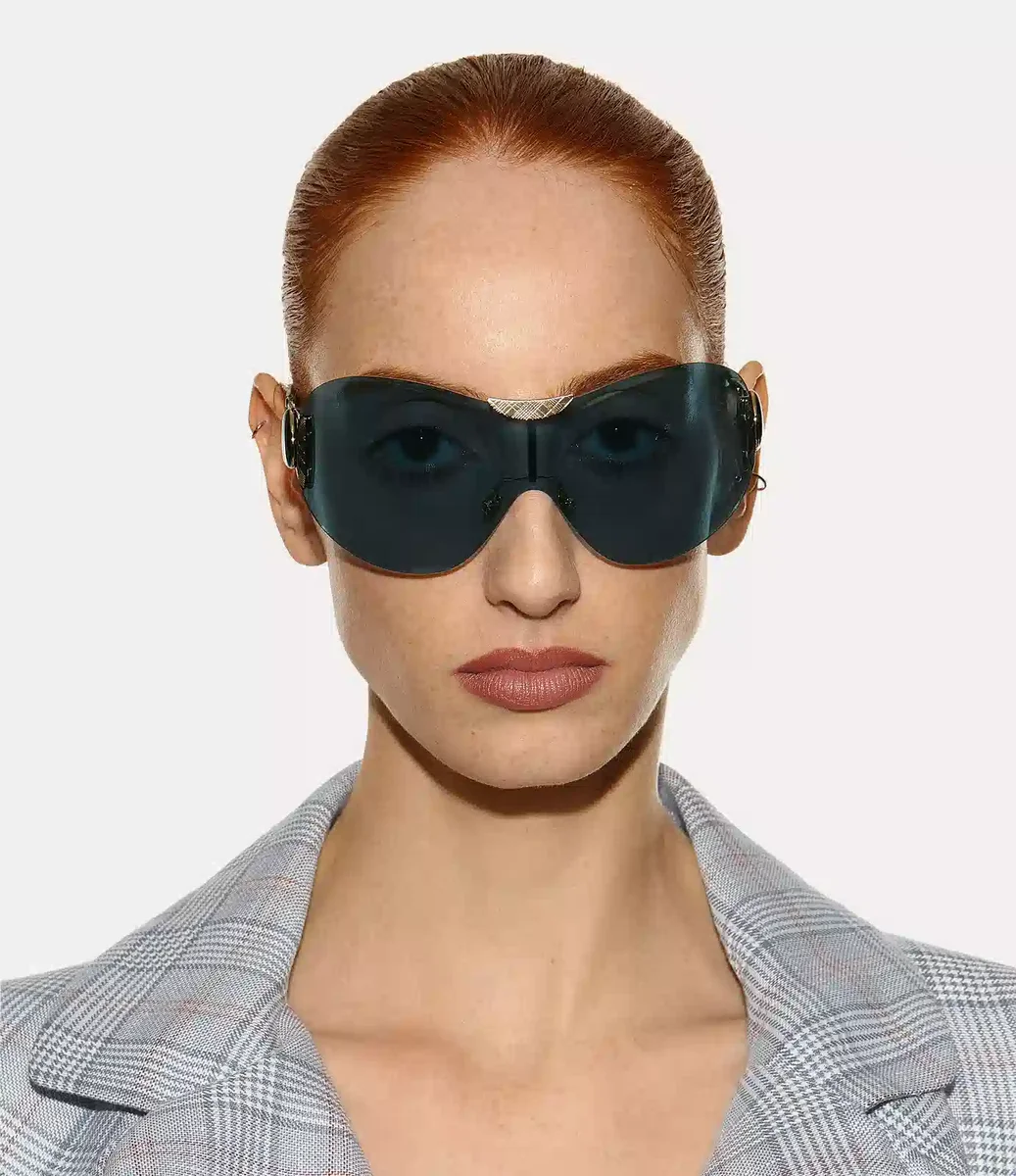 Die Tina Sonnenbrille, benannt nach der verstorbenen legendären Sängerin Tina Turner, zeichnet sich durch eine übertriebene, vintage-inspirierte Silhouette aus, die an die glamourösen Ikonen des Studio 54 erinnert. Das Modell verfügt über dunkelblaue Gläser mit UV-Schutz und ist an jedem Bügel mit einer handbemalten Emaille-Kugel verziert, die von viktorianischem Schmuck inspiriert ist.