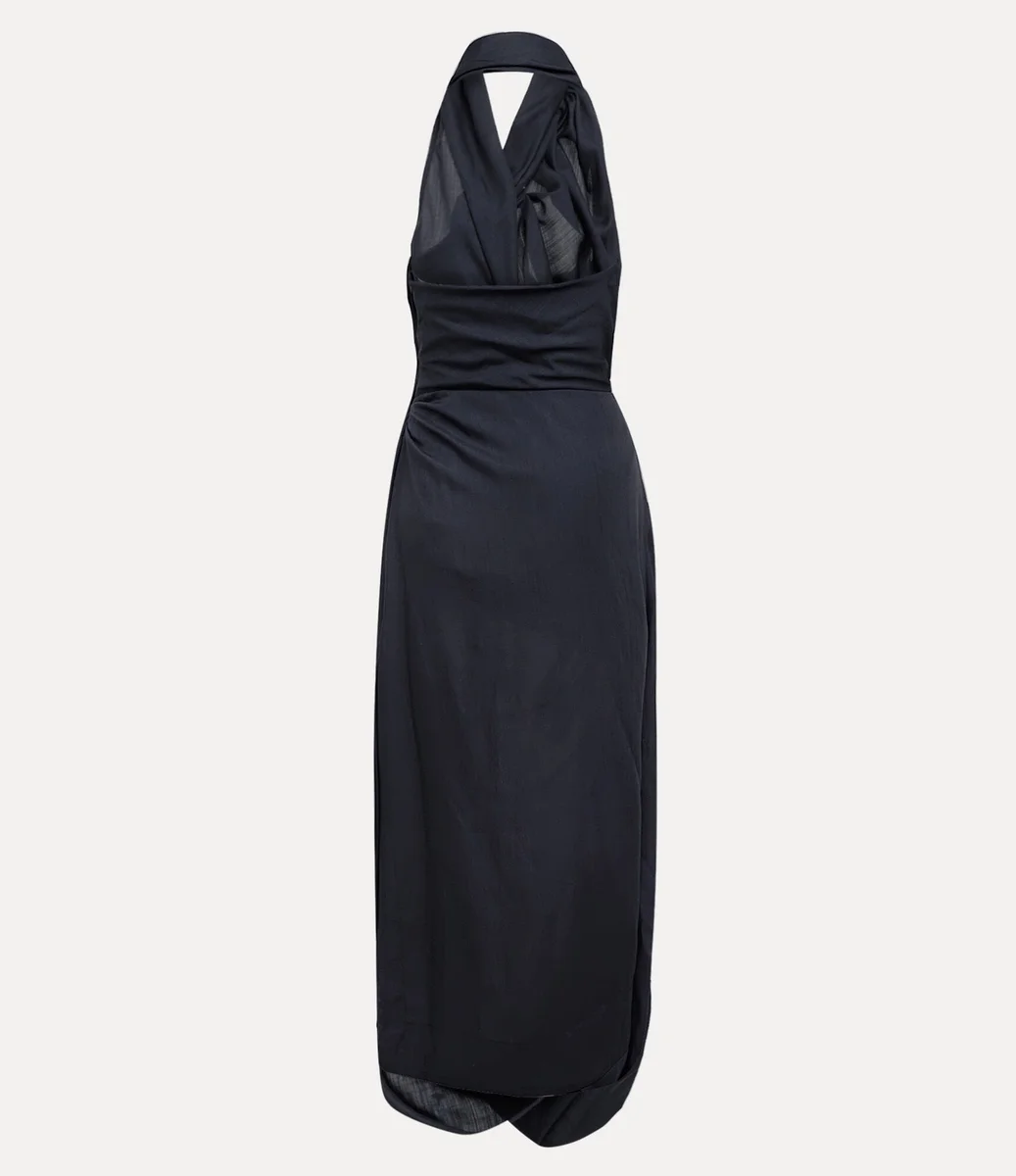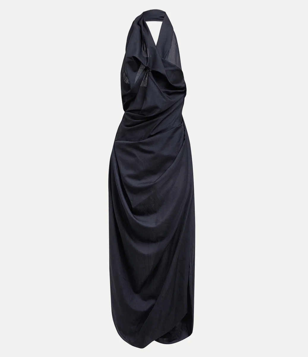 Das Halter-Kleid „Galatea” von Vivienne Westwood schmiegt sich in mehreren Lagen aus leichter, transparenter Wolle mit gedrehten Nähten an den Körper.