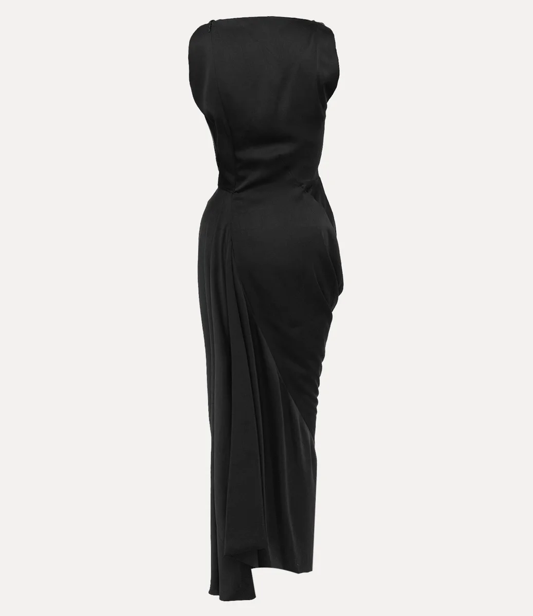 Das Long Fond Kleid zeichnet sich durch elegante Drapierungen am Ausschnitt und an der Taille aus und fällt in einer verlängerten Säulensilhouette mit asymmetrischem Saum. Das Kleidungsstück ist mit zusätzlichen Drapierungen am Rücken versehen und wird mit einem verdeckten seitlichen Reißverschluss geschlossen, der für ein glattes Finish sorgt.
