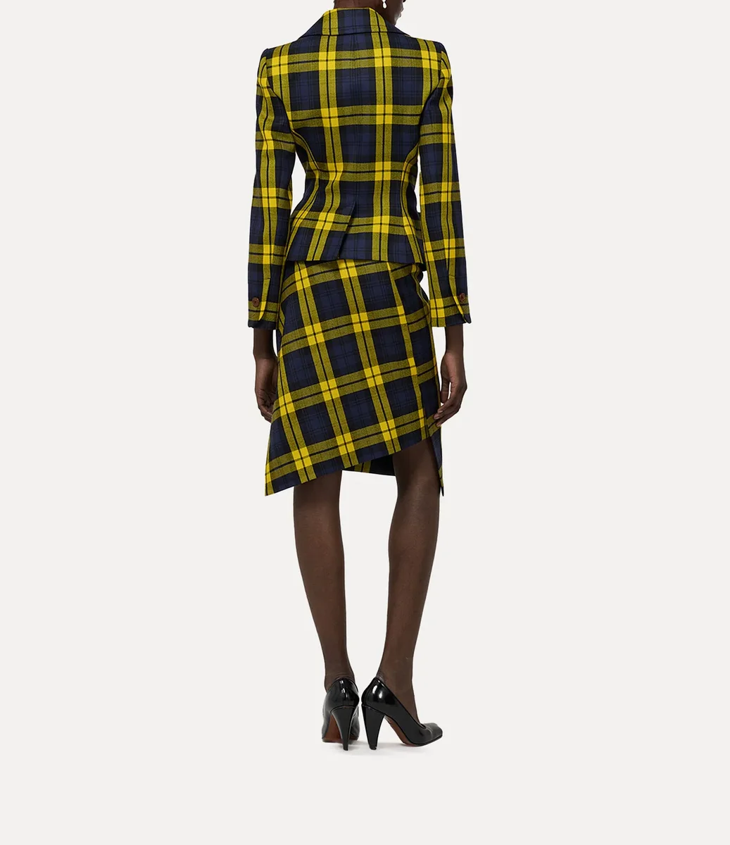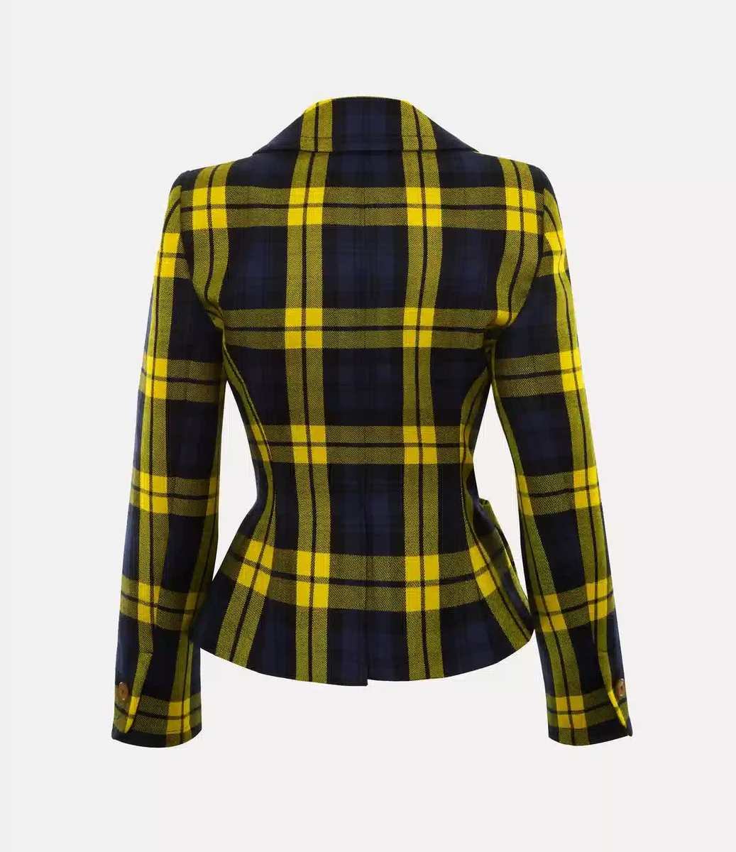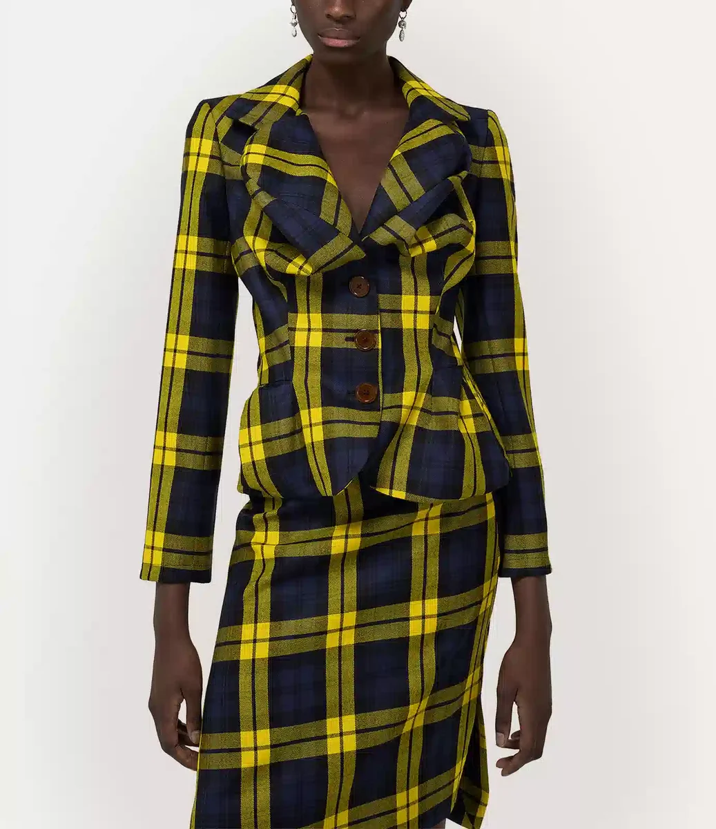Die Drunken Jacke verwendet Viviennes originelles experimentelles Schnittmuster-System „Drunken Tailoring“, bei dem Kleidungselemente verzerrt werden und eine fast surreale Form annehmen. Das Modell präsentiert sich in der Woll-Tartan-Karo „Moonshine“ dieser Saison mit leuchtenden Farben und einer Knopfleiste vorne.