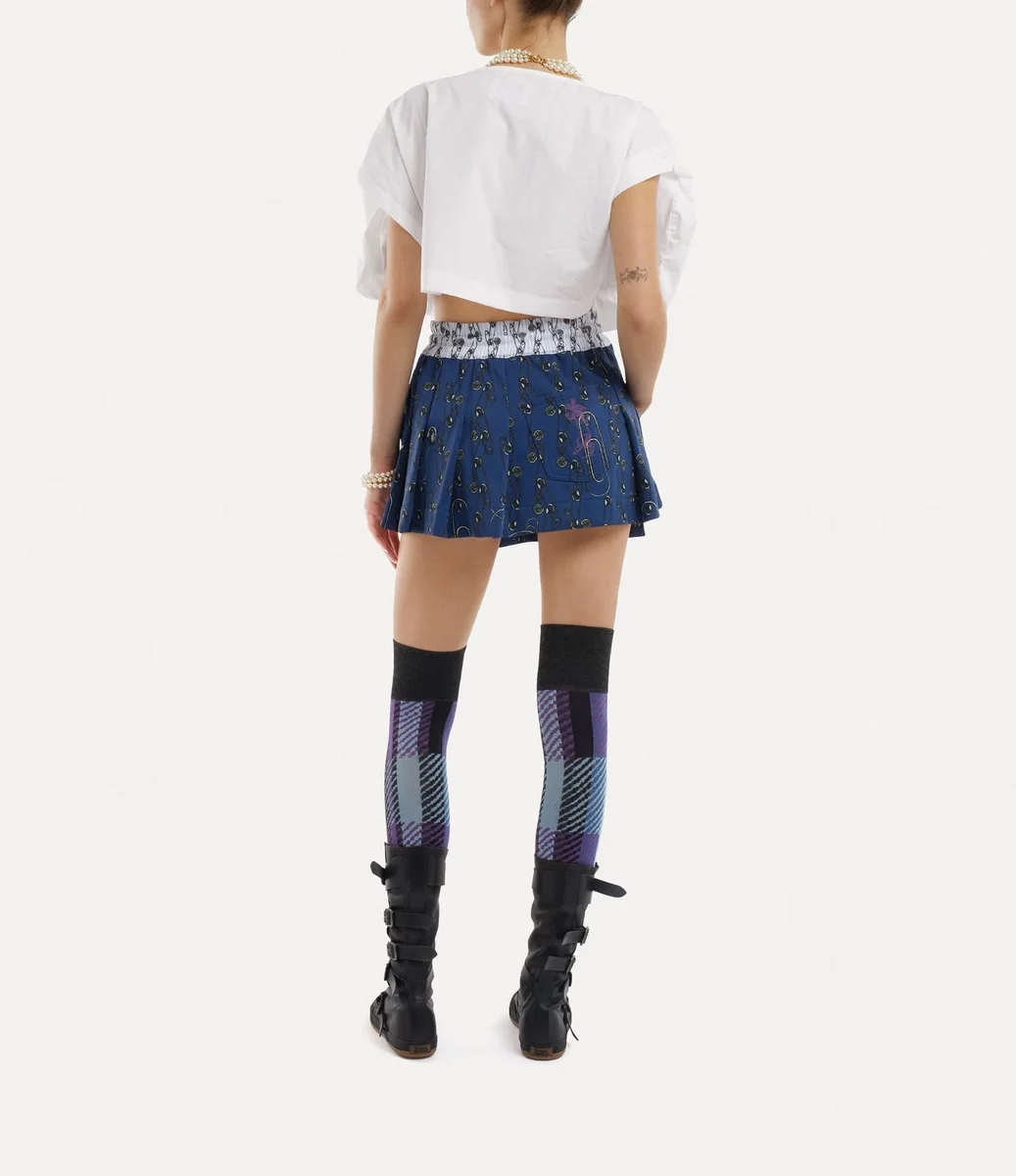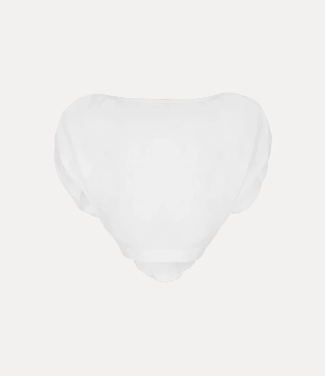 Die asymmetrische Herzform ist zu einem Markenzeichen des Hauses geworden und taucht seit jeher in vielen Kollektionen auf. Das Heart Top dieser Saison greift diese Silhouette wieder auf, mit der Vivienne ihre Zuneigung zur Menschheit und zum Planeten zum Ausdruck brachte, ergänzt durch ein gesticktes Wappen auf der linken Seite des Designs.