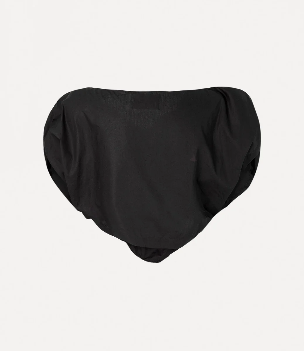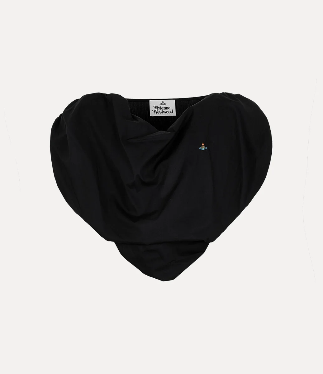 Die asymmetrische Herzform ist zu einem Markenzeichen des Hauses geworden und taucht seit jeher in vielen Kollektionen auf. Das Heart Top dieser Saison greift diese Silhouette wieder auf, mit der Vivienne ihre Zuneigung zur Menschheit und zum Planeten zum Ausdruck brachte, ergänzt durch eine gestickte Kugel auf der linken Seite des Designs.