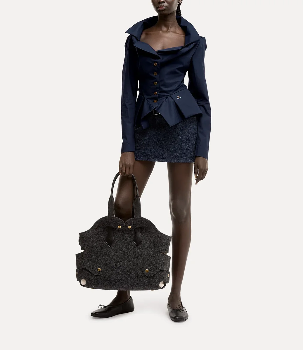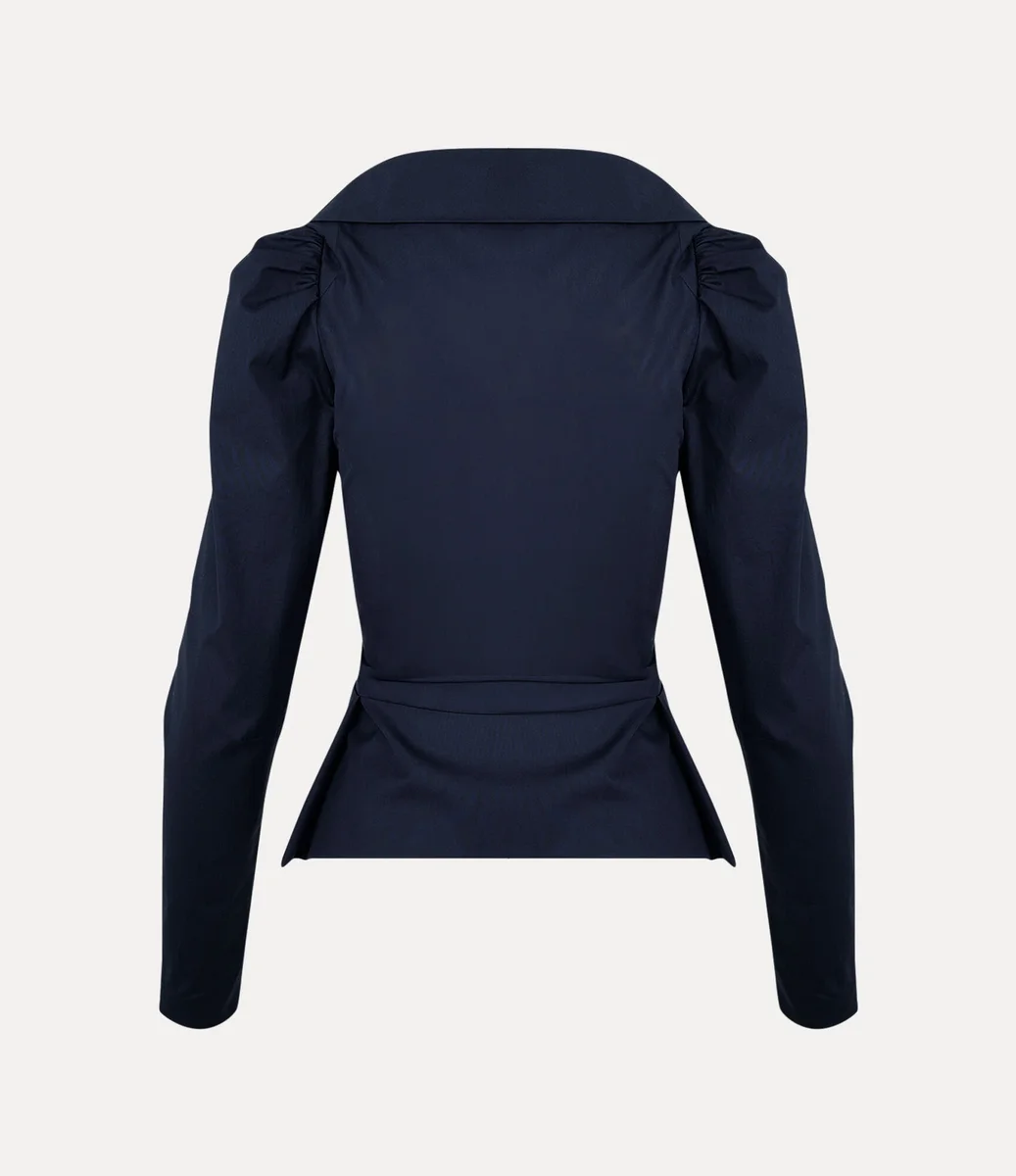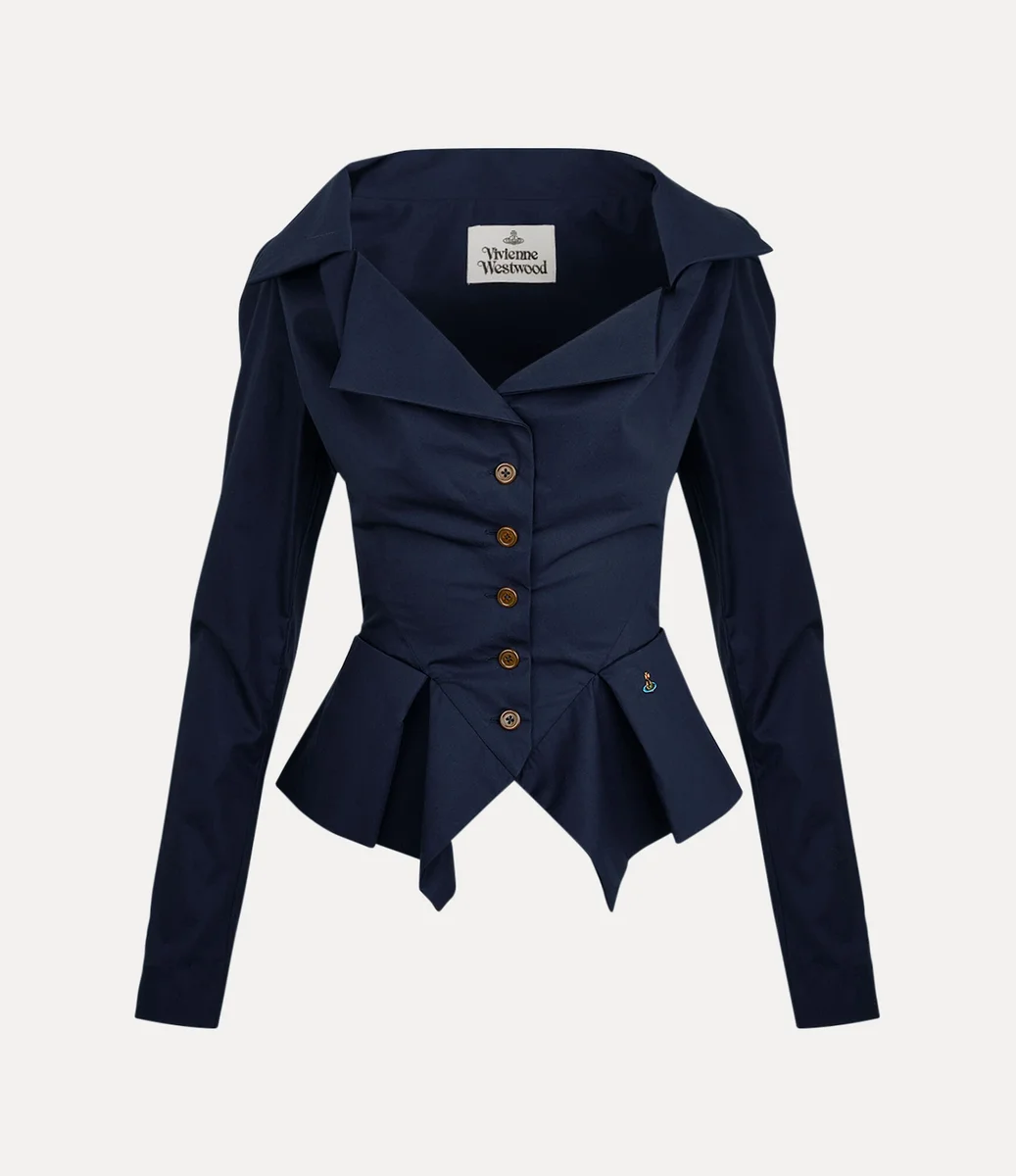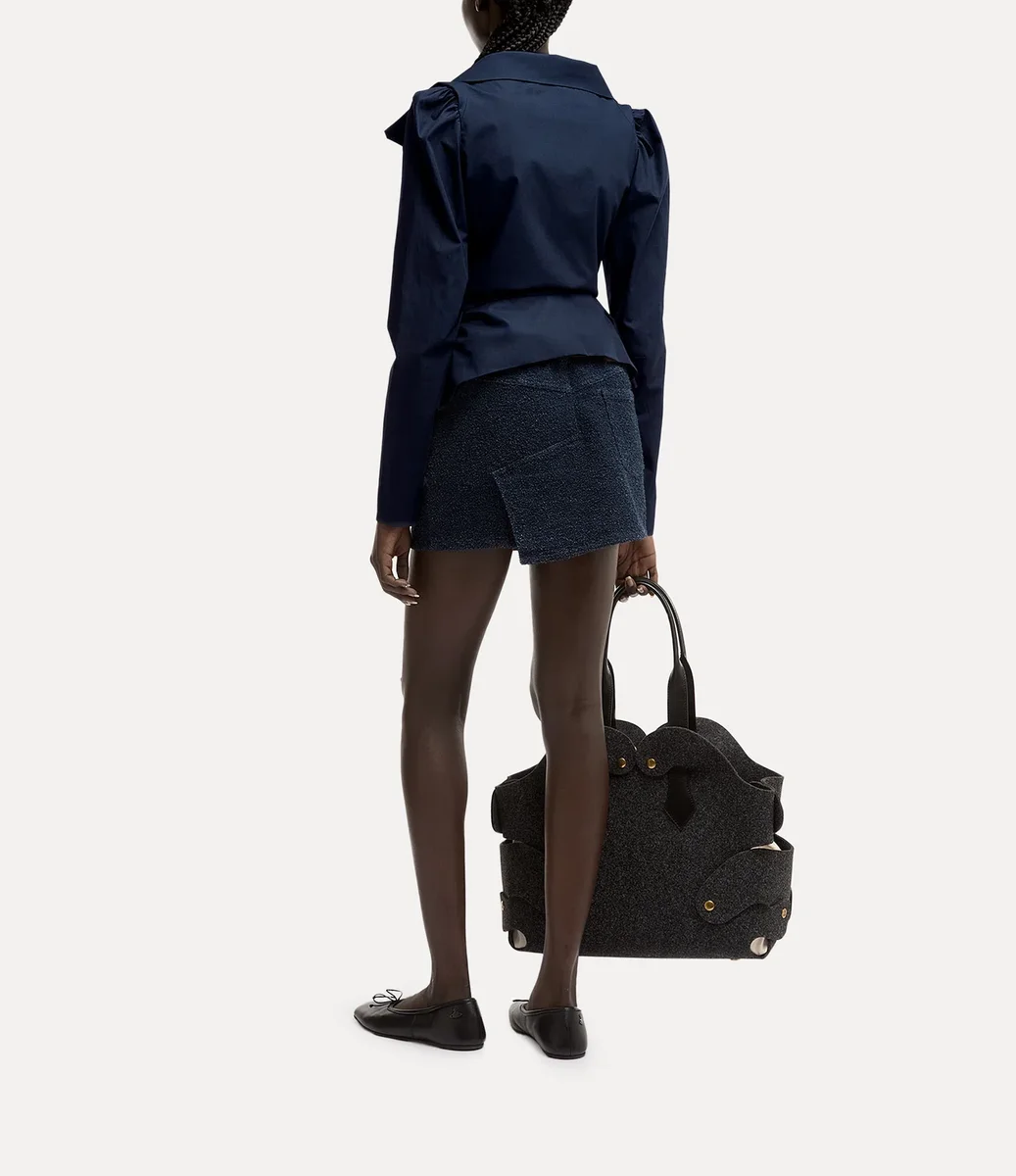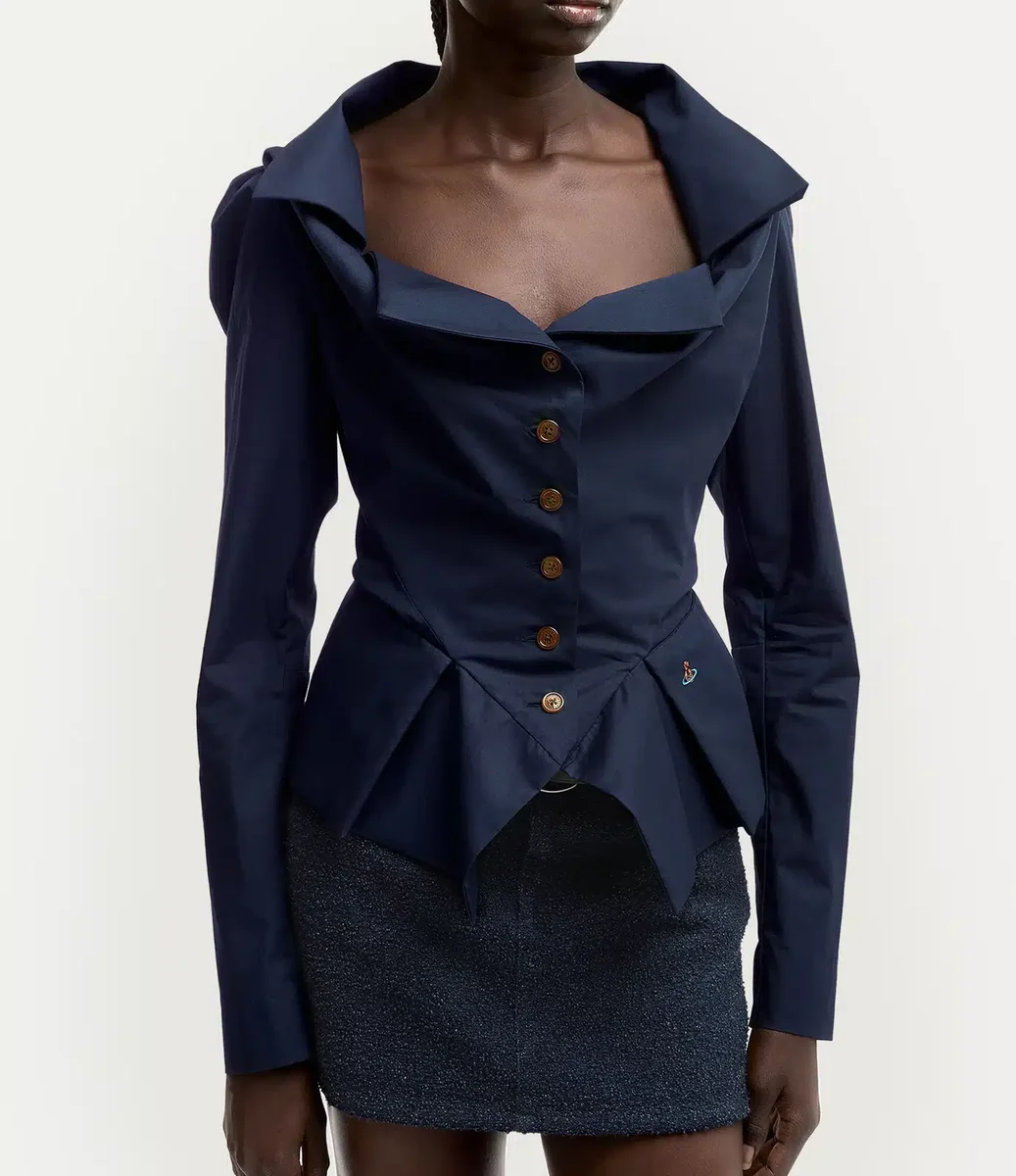 Unser Monday Shirt hat origamiartige Falten am Ausschnitt, die mit gravierten Knöpfen und unserer charakteristischen mehrfarbigen Orb-Stickerei an der Hüfte verziert sind. Das Kleidungsstück hat ein tailliertes Oberteil mit einer ausgestellten, plissierten Stoffverlängerung an der Taille und eleganten Puffärmeln.