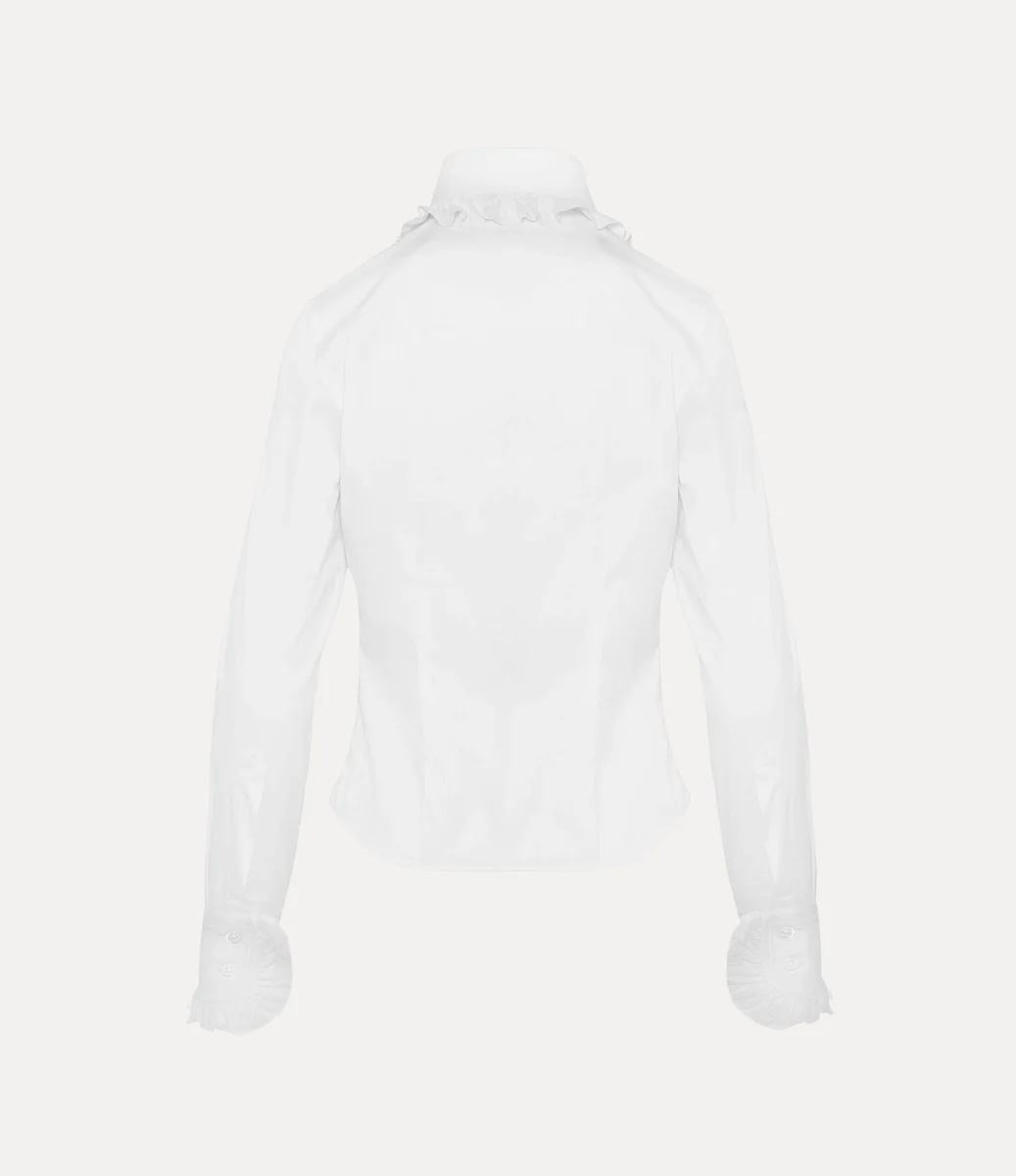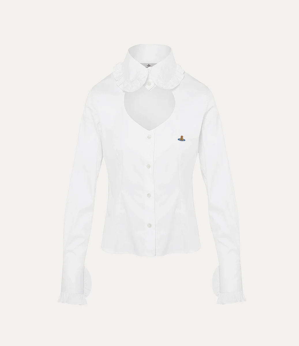 Das Toulouse Frill Shirt greift unseren klassischen Ausschnitt mit Herzausschnitt wieder auf – ein Symbol für Viviennes Liebe zur Menschheit und zum Planeten. Das Kleidungsstück ist mit unserer charakteristischen Orb-Stickerei auf der Brust verziert und verfügt über einen zart abgerundeten Kragen, der von gerafften Rüschen umrahmt wird.