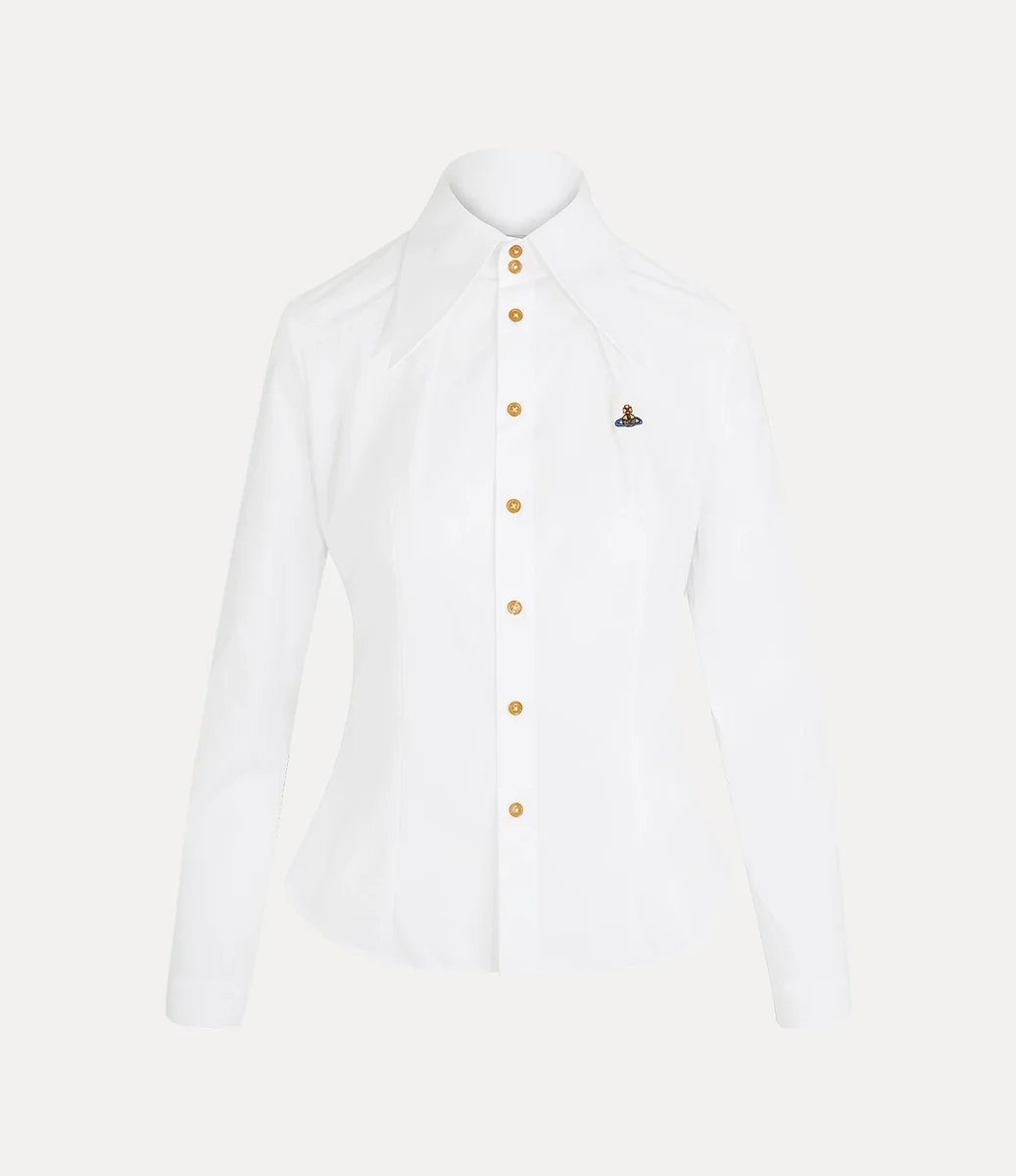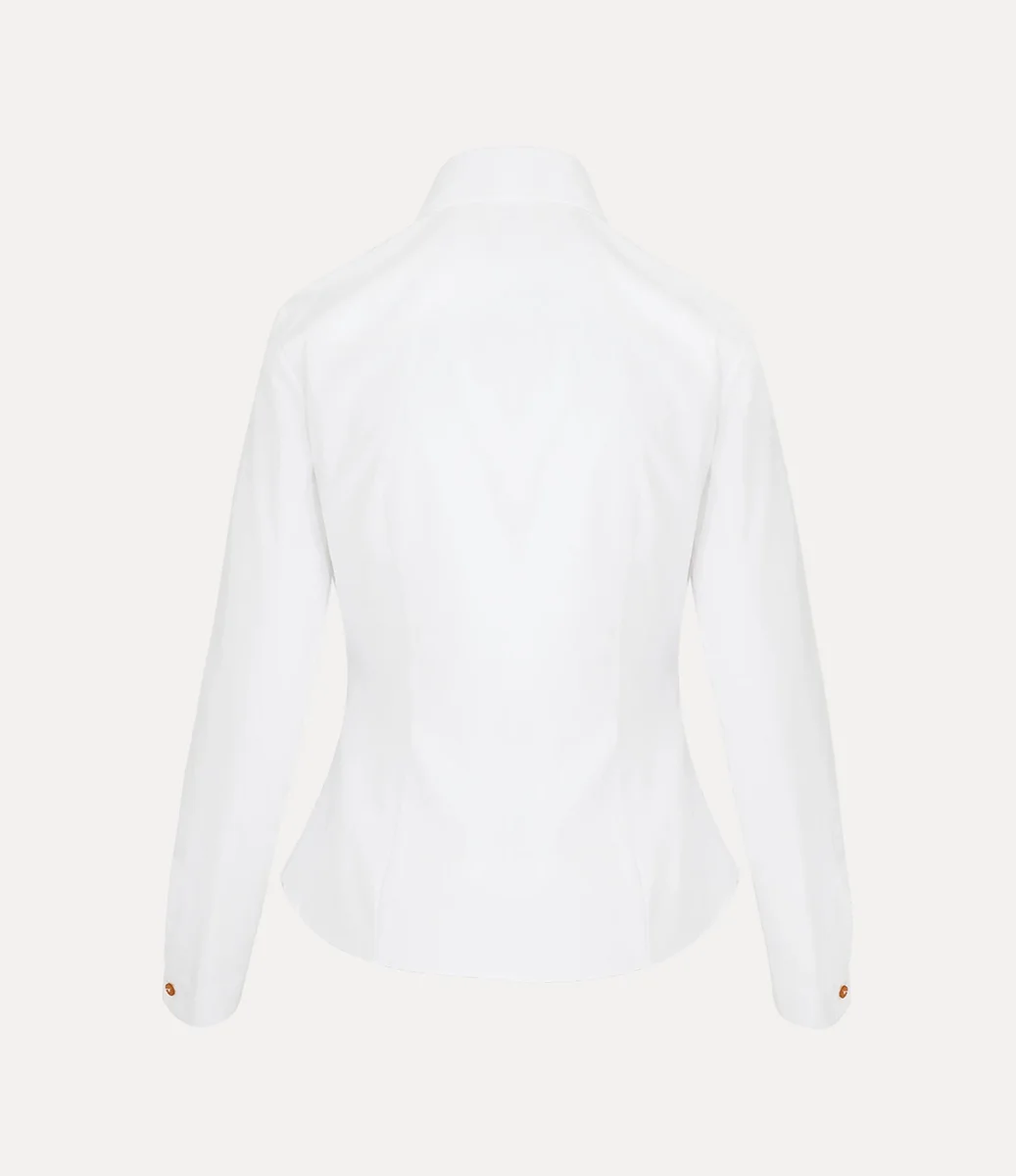 Das Vivienne Westwood W Violin Shirt verfügt über einen übergroßen Kragen mit spitzen Kanten, unseren charakteristischen Dreiknopfverschluss und ein gesticktes Kugelmotiv.