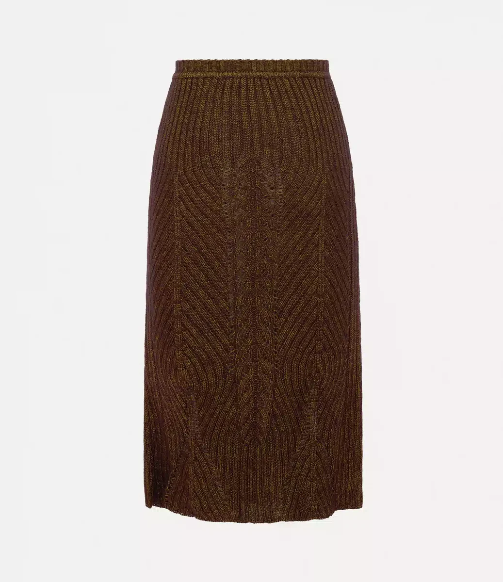 Der mittellange Mary-Rock ist aus einer Seiden-Mohair-Mischung gefertigt und zeichnet sich durch eine einzigartige Kombination aus Fischgräten- und Rippenstrick aus. Das Design bietet einen gerippten Bund und eine dezente A-Linien-Silhouette, die durch die Strickstruktur geformt wird. Die mehrfarbige Stickerei am Saum spiegelt die Philosophie des Hauses wider, die Vergangenheit in die Zukunft zu tragen.