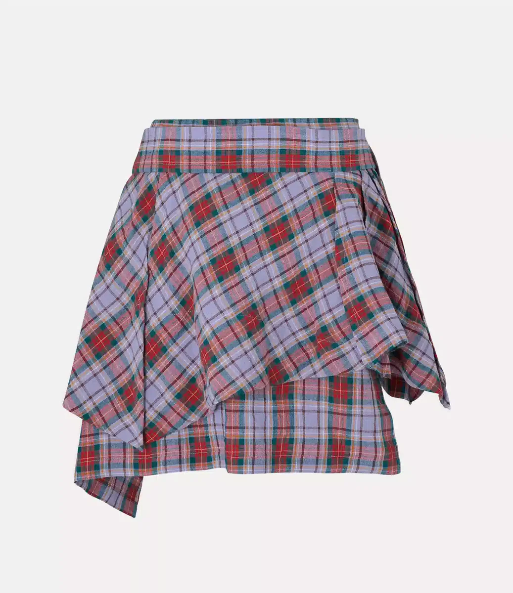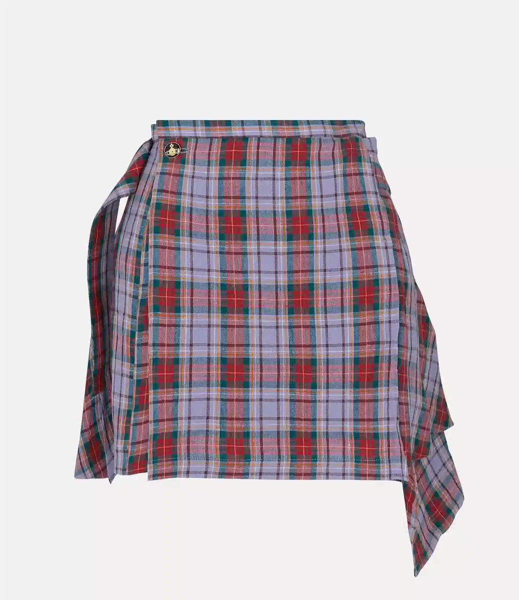 Der Meghan-Kilt von Vivienne Westwood aus Leinen wurde in dieser Saison mit dem auffälligen „Louth Tartan”-Motiv in Rot-, Grün- und Violetttönen neu interpretiert.