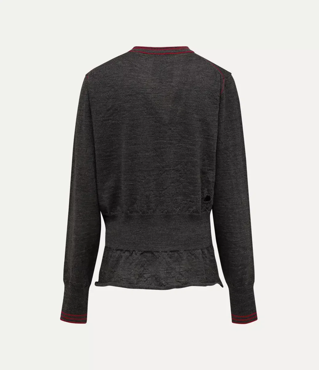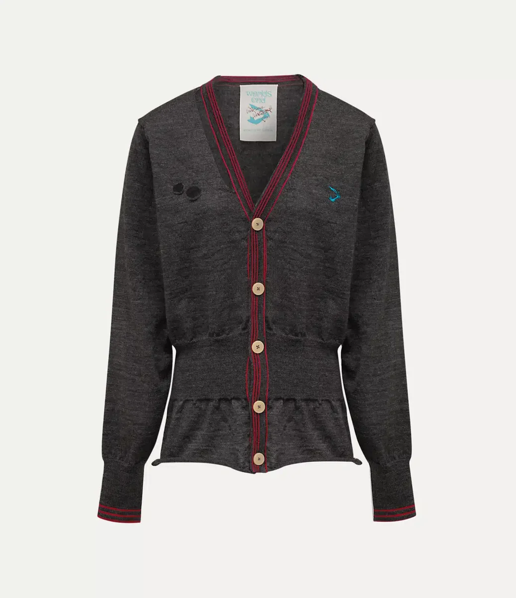 Unsere Strickjacke Worlds End Chaos hat eine Knopfleiste vorne und einen V-Ausschnitt, ergänzt durch das „Arm and Cutlass”-Detail auf der linken Brustseite. Das Kleidungsstück ist mit einem gerollten Saum und zwei Schlitzen vorne versehen, die an Viviennes ikonische „CHAOS”-Kollektion erinnern und ihren rebellischen Geist und ihr Engagement für die Infragestellung politischer Konventionen verkörpern.