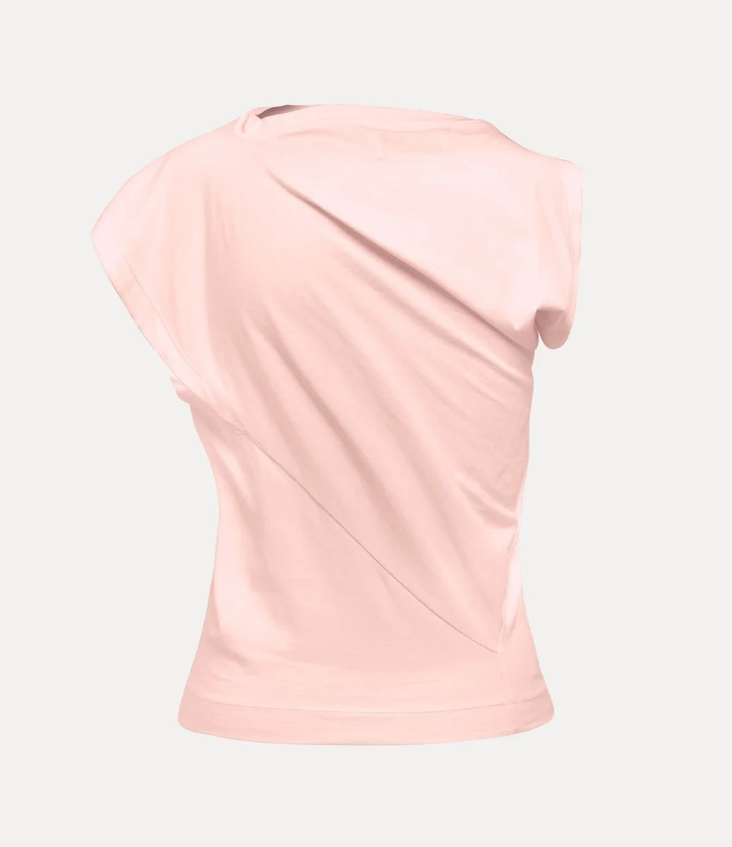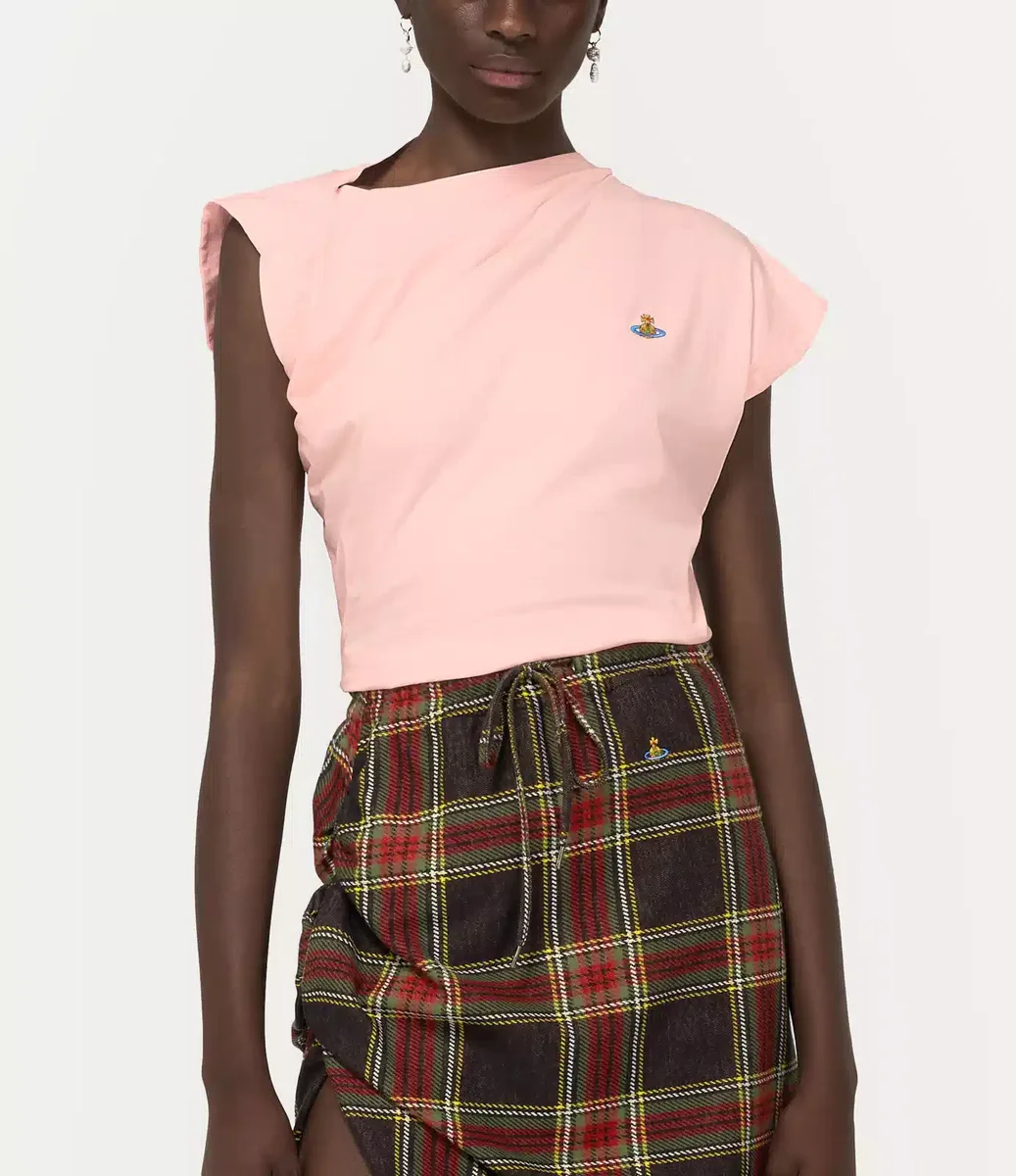 Das charakteristische Hebo-Top des Hauses wurde überarbeitet und präsentiert sich in dieser Saison mit einem weichen Baumwollfinish und einer Kugelstickerei auf der linken Brustseite – ein Synonym für Viviennes Vision, Tradition in die Zukunft zu tragen. Die Silhouette umfasst Viviennes charakteristischen, von Schlitzen inspirierten Ausschnitt, Drapierungsdetails und gedrehten Stoff auf der Rückseite des Designs.