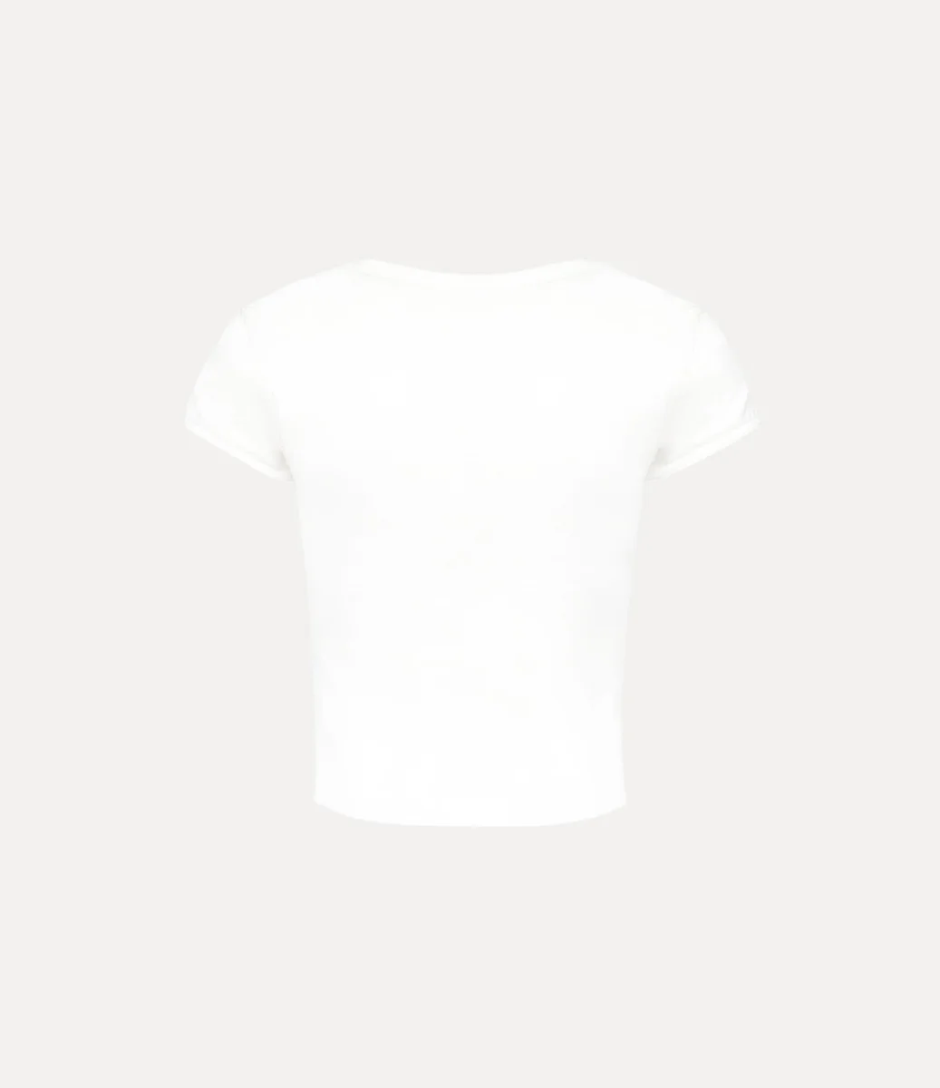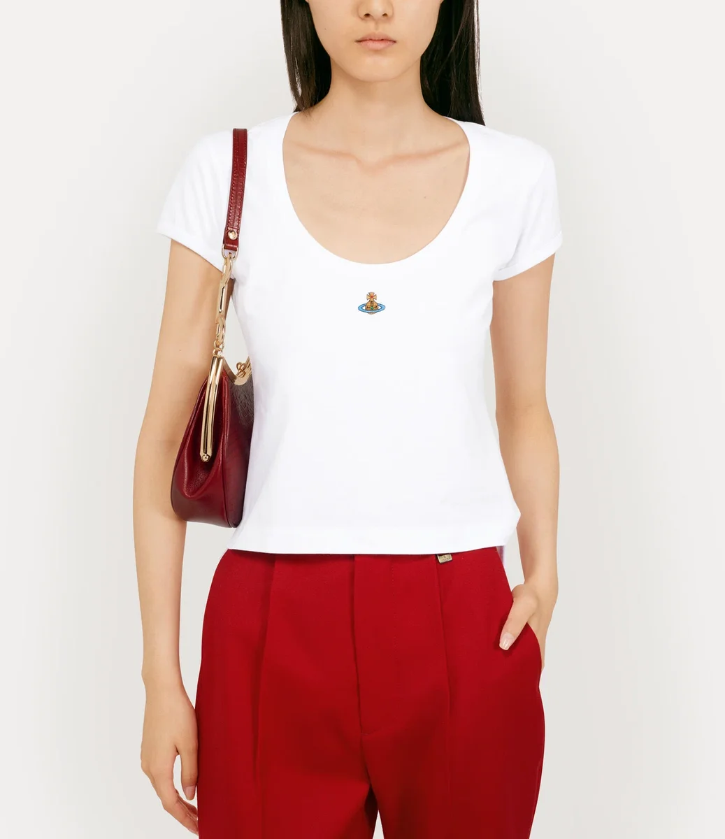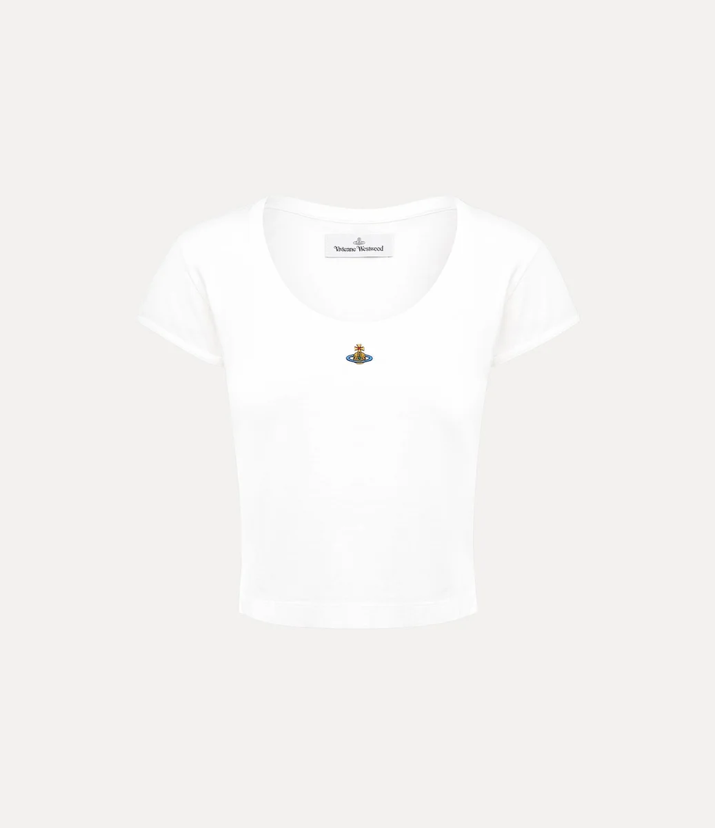 Unser Micro Lollo T-Shirt hat eine verkürzte Baumwollsilhouette mit kurzen Ärmeln und einem tiefen Rundhalsausschnitt. Das Kleidungsstück ist in der Mitte der Brust mit einer mehrfarbigen Orb-Stickerei verziert, die Tradition symbolisiert und von den himmlischen Ringen des Saturn umgeben ist, die für die Zukunft stehen.
