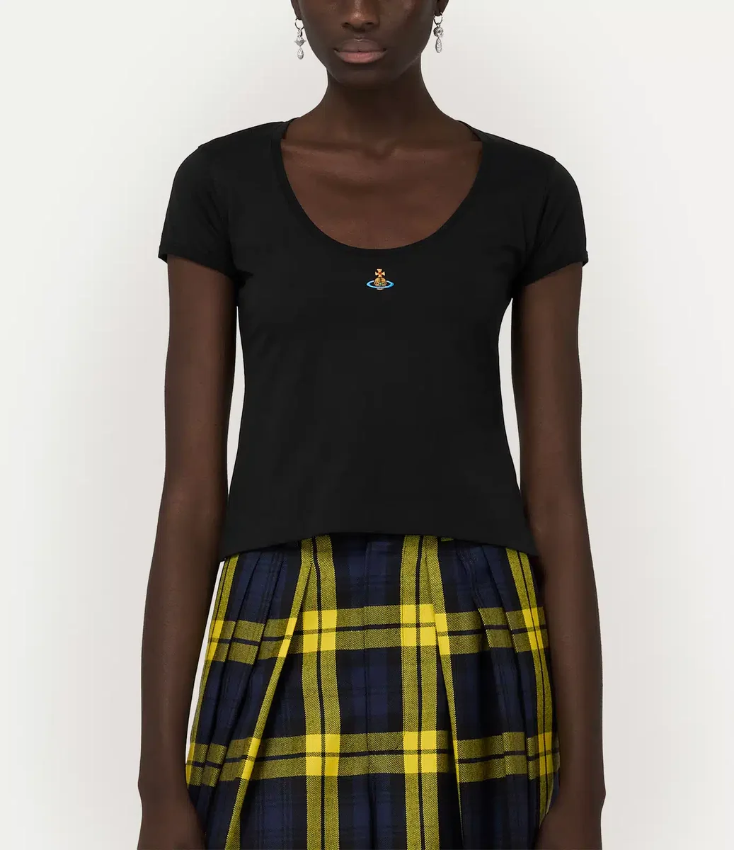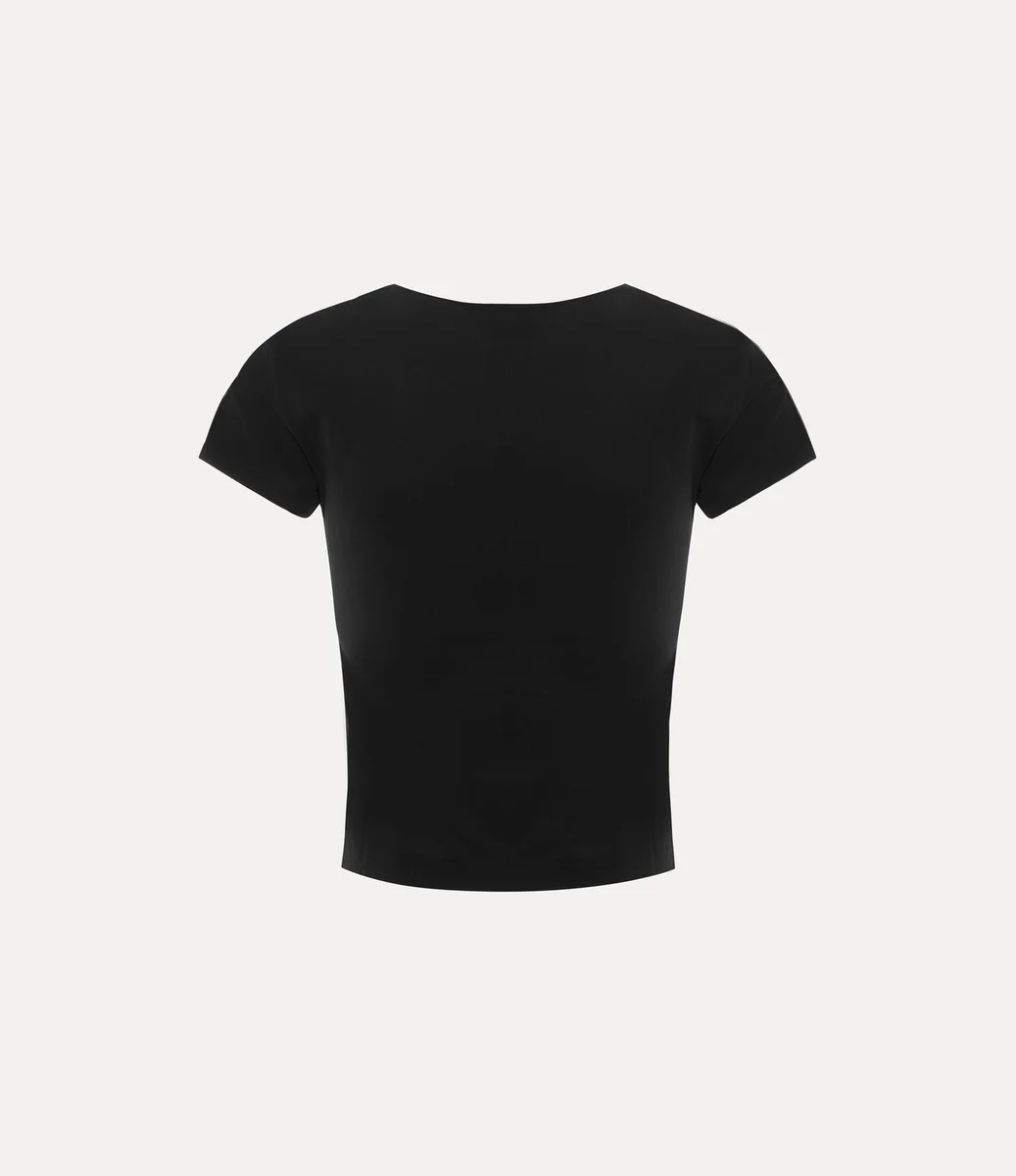 Unser Micro Lollo T-Shirt hat eine verkürzte Baumwollsilhouette mit kurzen Ärmeln und einem tiefen Rundhalsausschnitt. Das Kleidungsstück ist in der Mitte der Brust mit einer mehrfarbigen Kugelstickerei verziert, die Tradition symbolisiert und von den himmlischen Ringen des Saturn umgeben ist, die für die Zukunft stehen.