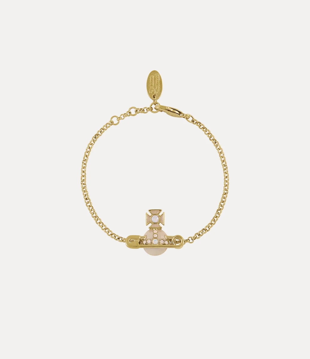 Unser Kitty-Armband wurde in dieser Saison mit einer polierten Goldbeschichtung und klassischen Metallbeschlägen neu interpretiert. Das zentrale Kugelmotiv wird durch handbemalte, durchscheinende Emaille akzentuiert und durch ein klassisches Sicherheitsnadel-Motiv durchbrochen, eine Anspielung auf Viviennes charakteristische Punk-Ästhetik.