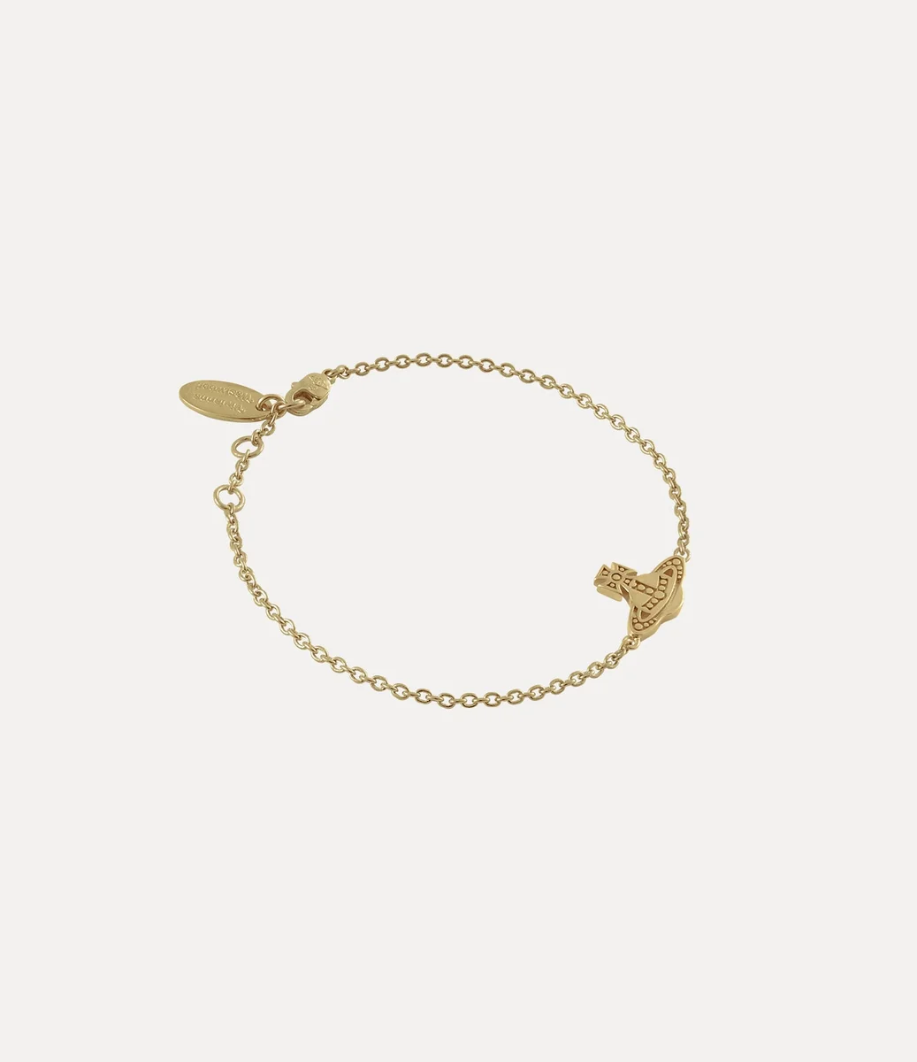 Unser Marinetta-Armband ist aus goldfarbenem Metall gefertigt und mit dem charakteristischen Kugelmotiv des Hauses verziert. Das Design zeichnet sich durch eine sanft geprägte, perlenartige Textur aus, die ihm ein handgefertigtes Aussehen verleiht, während gravierte Details die Konturen des Kreuzes und des Saturnrings betonen.