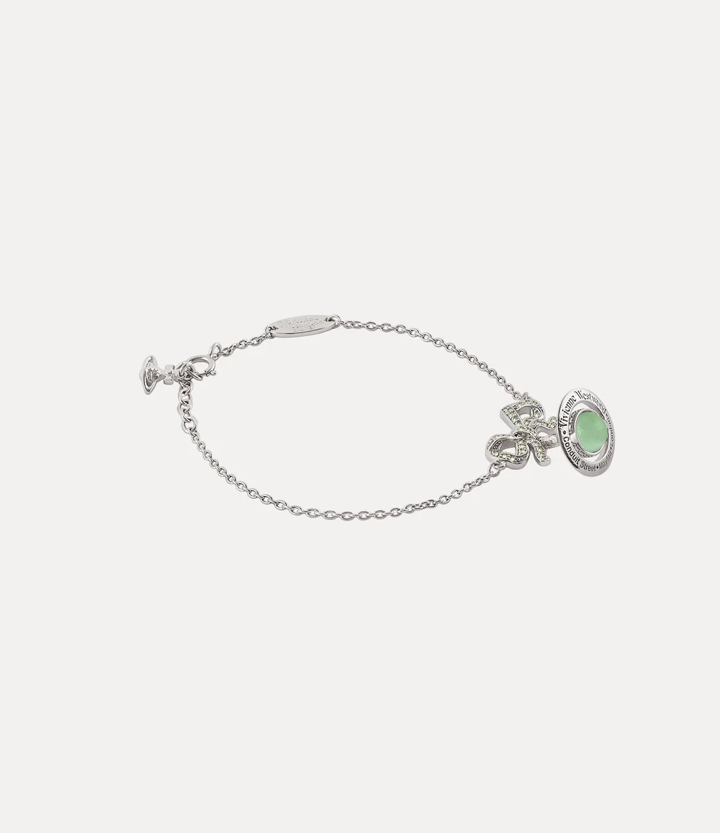 Das Armband Octavie ist aus recyceltem Silber mit einer polierten platinfarbenen Beschichtung gefertigt und mit einem aufwendigen, georgianisch inspirierten Bogenanhänger verziert. Das mit funkelnden grünen Pavé-Kristallen besetzte Design wird durch eine farblich abgestimmte Glaskugel in der Mitte abgerundet, die mit unserem charakteristischen Metalllogo kombiniert ist.