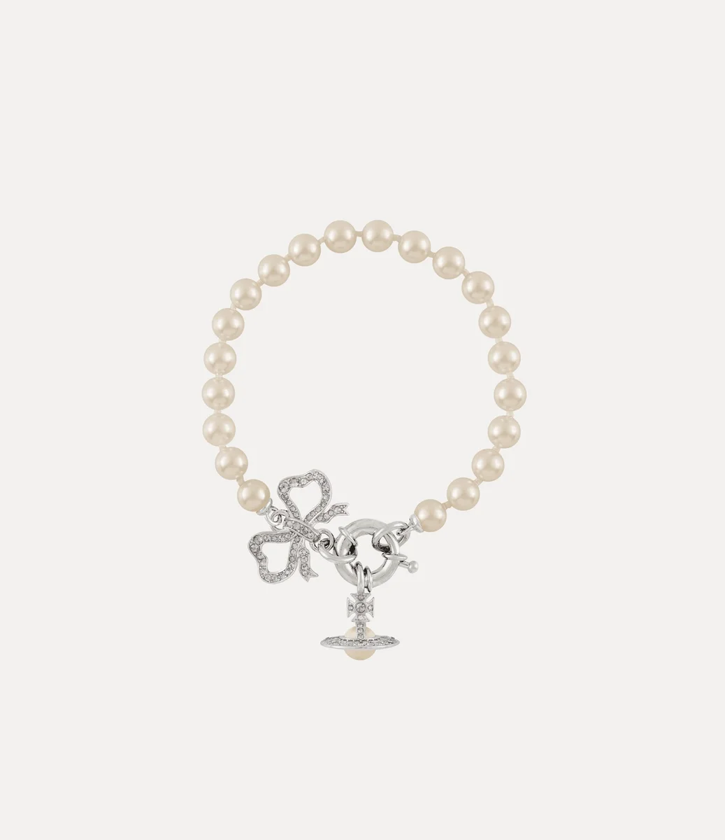 Das Rigoberta Pearl Armband lässt den historischen Schmetterlingsanhänger, ein charakteristisches Symbol des Hauses, mit opulenten Perlen und kristallverzierten Details wieder aufleben. In der Mitte des Designs befindet sich ein dreidimensionales Kugelmotiv, das mit einem polierten Federclipverschluss versehen ist.