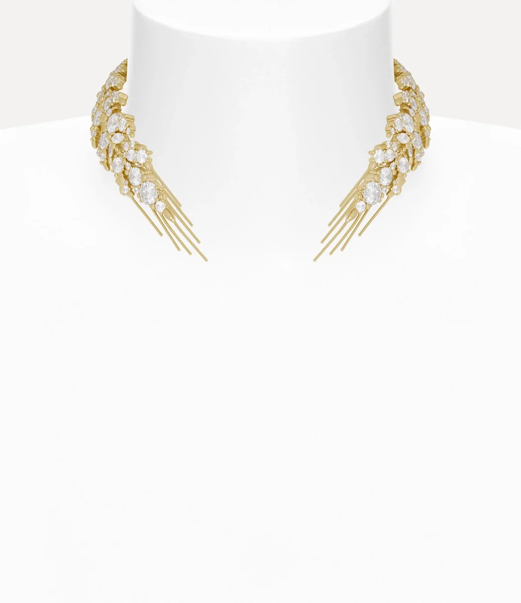 Die von der griechischen Mythologie inspirierte Chloris Halskette verfügt über zwei zart ineinander verschlungene Weizenmotive, die für Wohlstand, Fruchtbarkeit und Überfluss stehen. Das Design, das erstmals in Andreas Kronthalers Frühjahr/Sommer-Kollektion 2024 vorgestellt wurde, liegt elegant am Ausschnitt an, ist mit glitzernden Pavé-Kristallen verziert und verfügt über einen dezenten Scharnierverschluss auf der Rückseite.