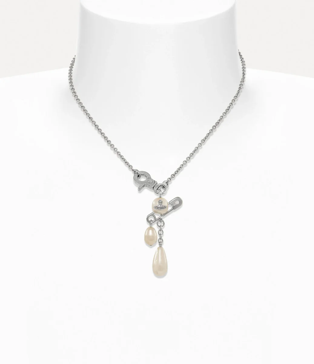 Die Halskette Claude Small verfügt über eine abgerundete Perle mit einer zentralen Kugel, die durch ein charakteristisches Sicherheitsnadel-Detail akzentuiert wird – eine Anspielung auf Viviennes punkinspirierten, nonkonformistischen Stil. Eine Perlentropfen und zarte Kettenelemente hängen elegant am Anhänger und verleihen dem Design Bewegung, während der von Metallteilen inspirierte Verschluss ein einfaches Schließen ermöglicht.