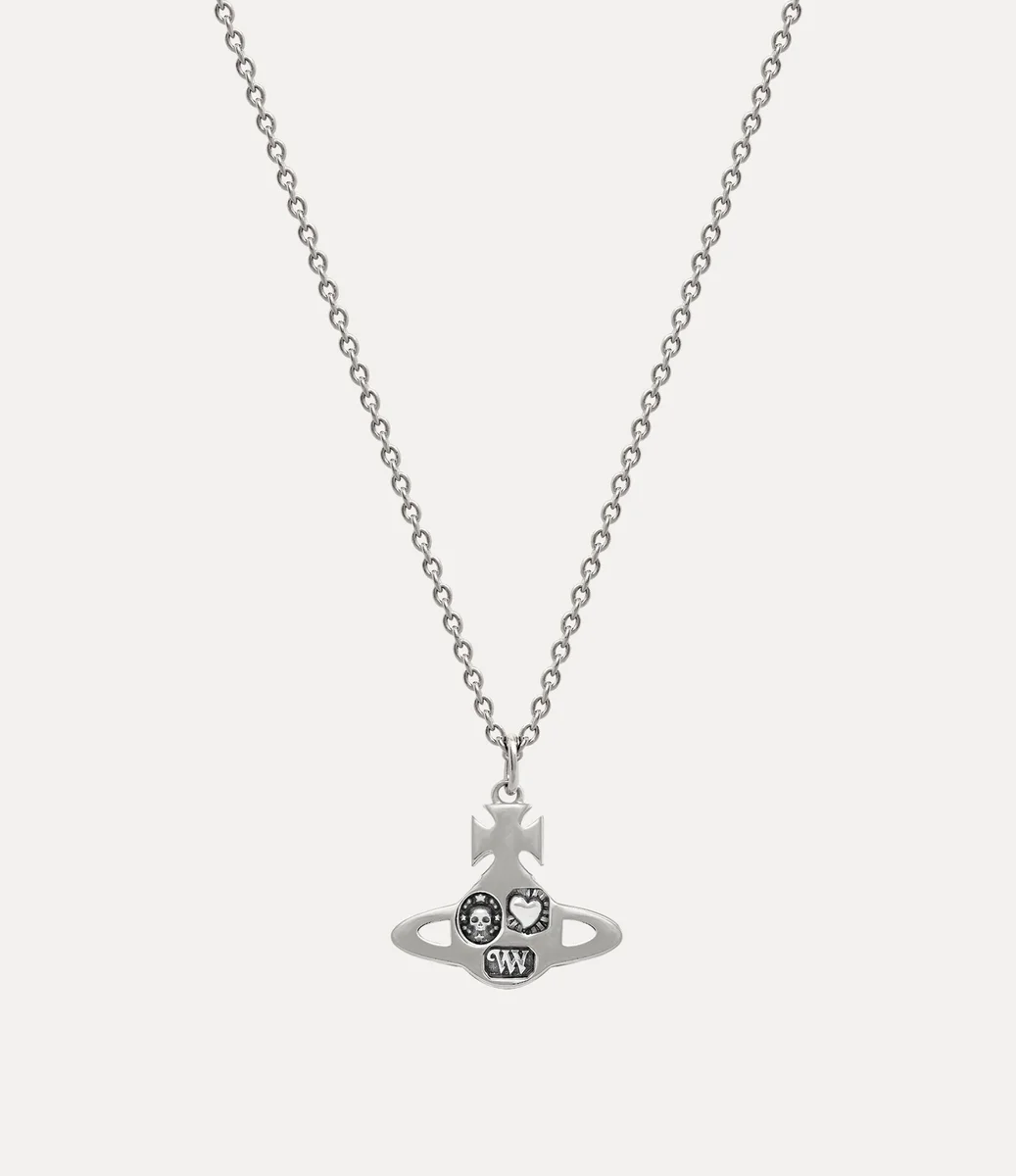 Unsere Crispin-Anhänger-Halskette ist von traditionellen Punzierungen inspiriert und verfügt über eine aufwendig detaillierte Hausikonografie in der Mitte, die wie in das Design eingeprägt wirkt. Das Stück ist mit unserer charakteristischen Kugel-Silhouette verziert und wird durch eine antike Beschichtung aufgewertet.