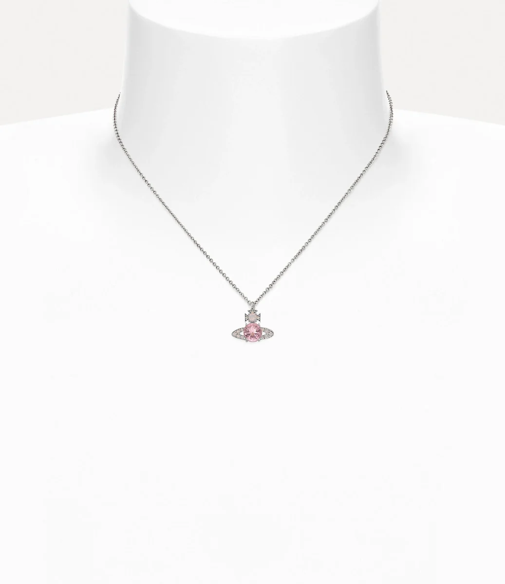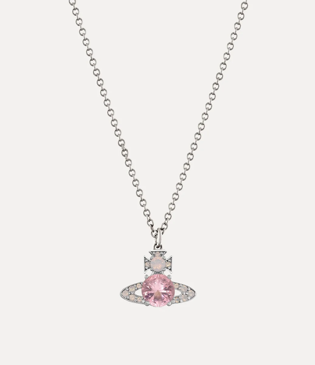 Unsere Ismene-Anhänger-Halskette ist in dieser Saison in polierter, silberfarbener Beschichtung erhältlich. Das Design zeichnet sich durch glitzernde rosa Kristalldetails aus, ergänzt durch einen Karabinerverschluss und ein verziertes Kugelmotiv in der Mitte des Designs, das Viviennes Vision widerspiegelt, Tradition in die Zukunft zu tragen.