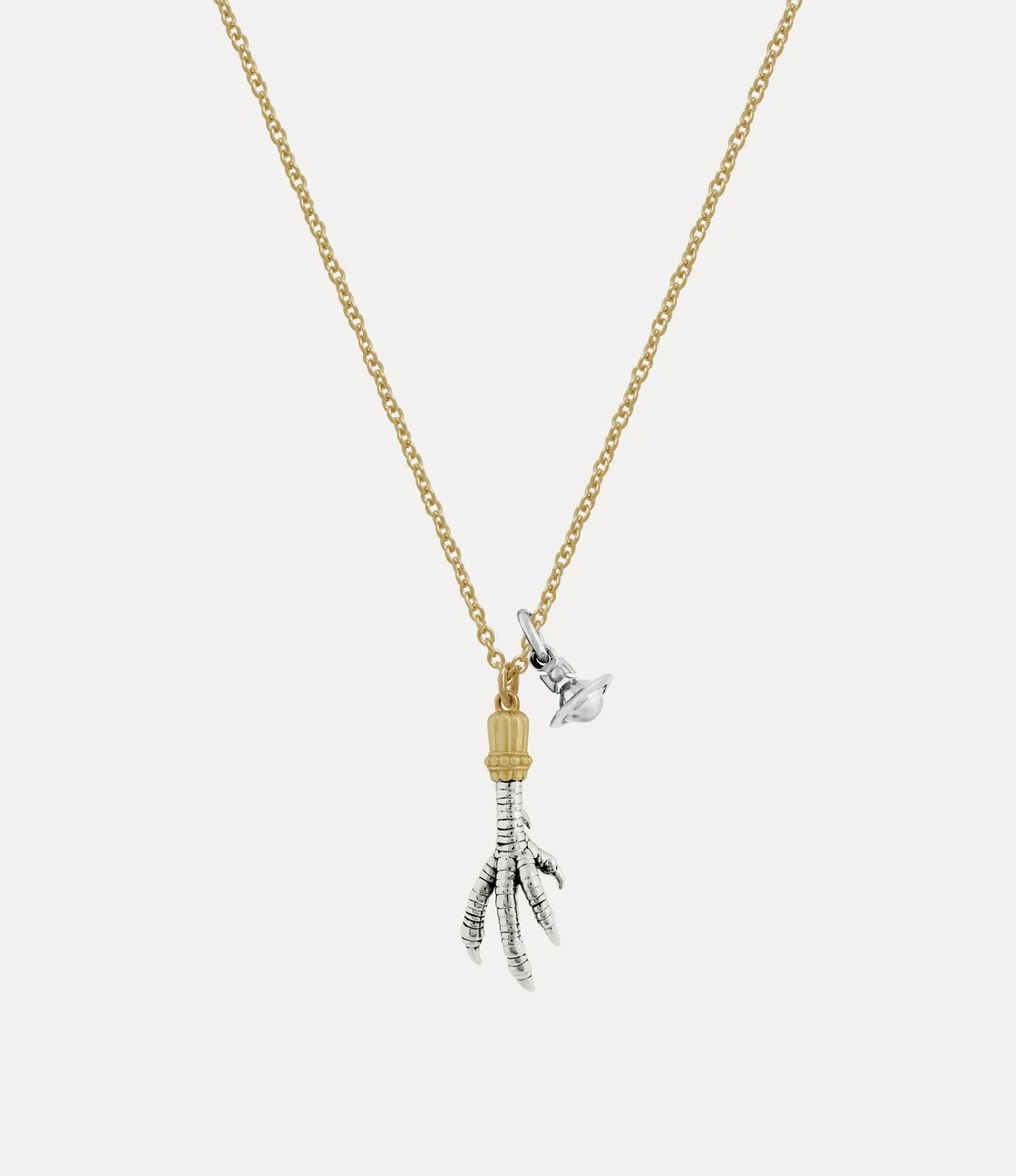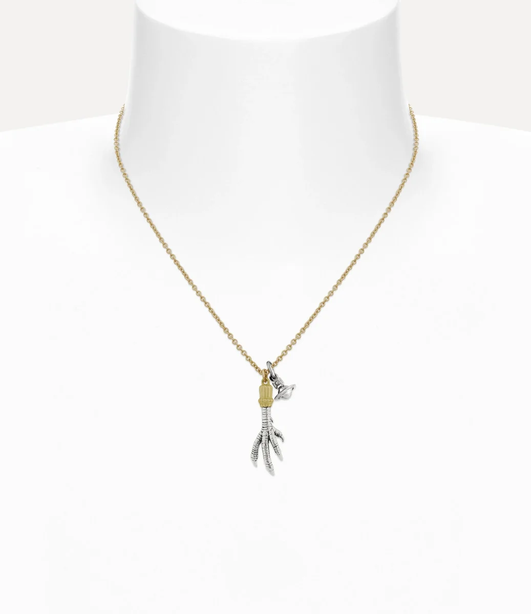 Die Joselita-Anhänger-Halskette ist mit dem auffälligen Hühnerfußmotiv dieser Saison verziert, einem Symbol für Glück. Der Anhänger ist mit einer schwarzen Patina versehen, um seine Texturen hervorzuheben, und verfügt über ein Finish aus verschiedenen Metallen mit polierter Beschichtung und einer baumelnden Kugel, die das Ethos des Hauses symbolisiert, die Vergangenheit in die Zukunft zu tragen.