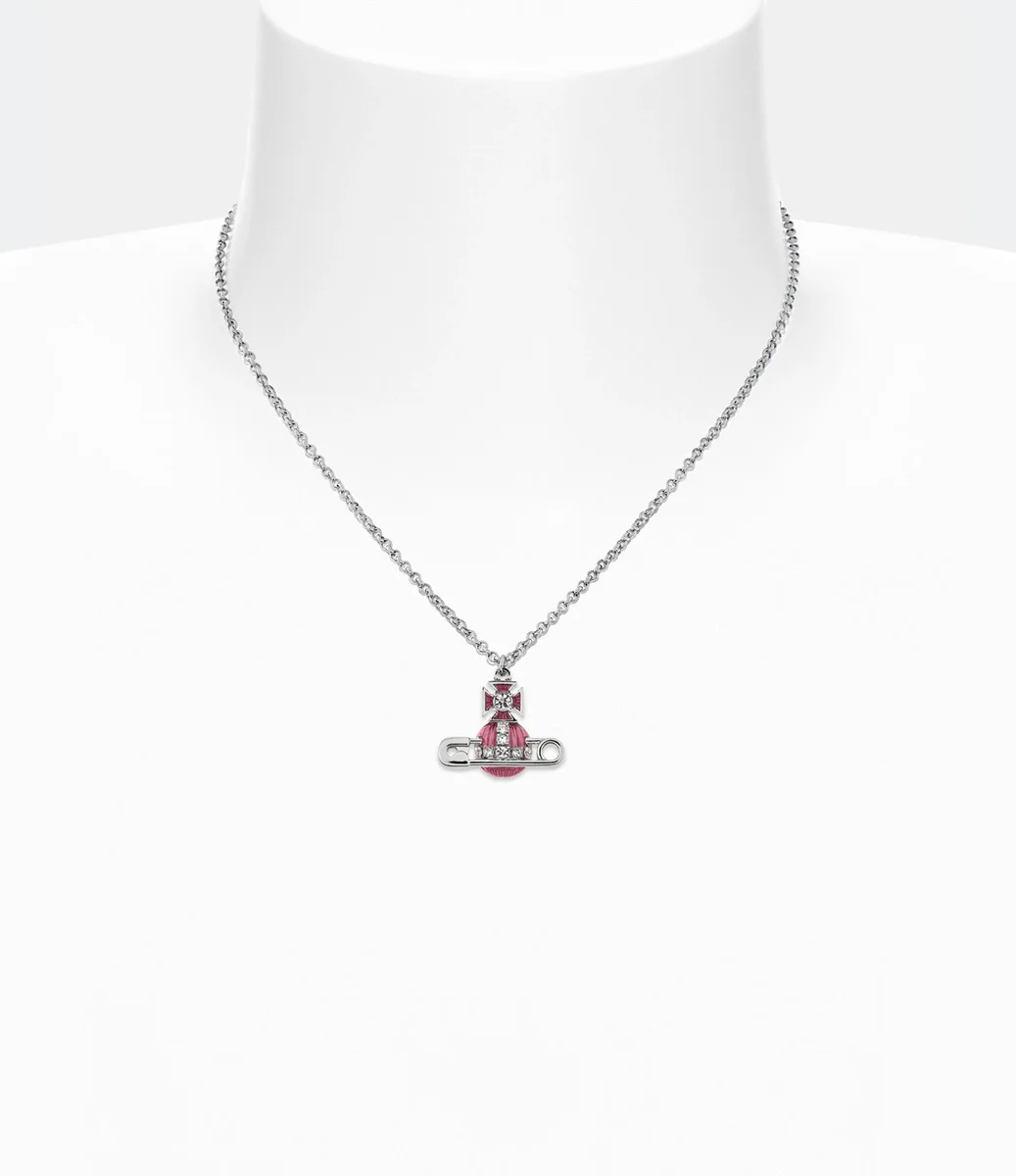 Unsere Kitty-Anhänger-Halskette verfügt über unser klassisches Kugel-Emblem, das von Hand mit durchscheinendem rosafarbenem Emaille bemalt wurde, um das darunterliegende komplexe Metallmuster sichtbar zu machen. Das Schmuckstück ist versilbert und mit einem Sicherheitsnadel-Motiv versehen, einem Symbol für Nonkonformismus, das an Viviennes charakteristischen Punk-Stil erinnert.