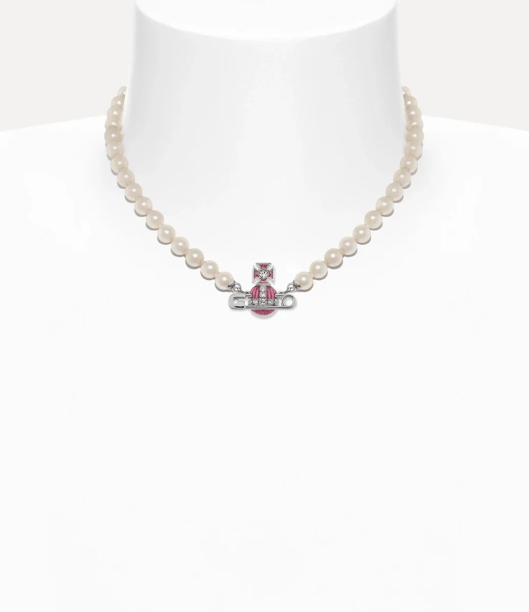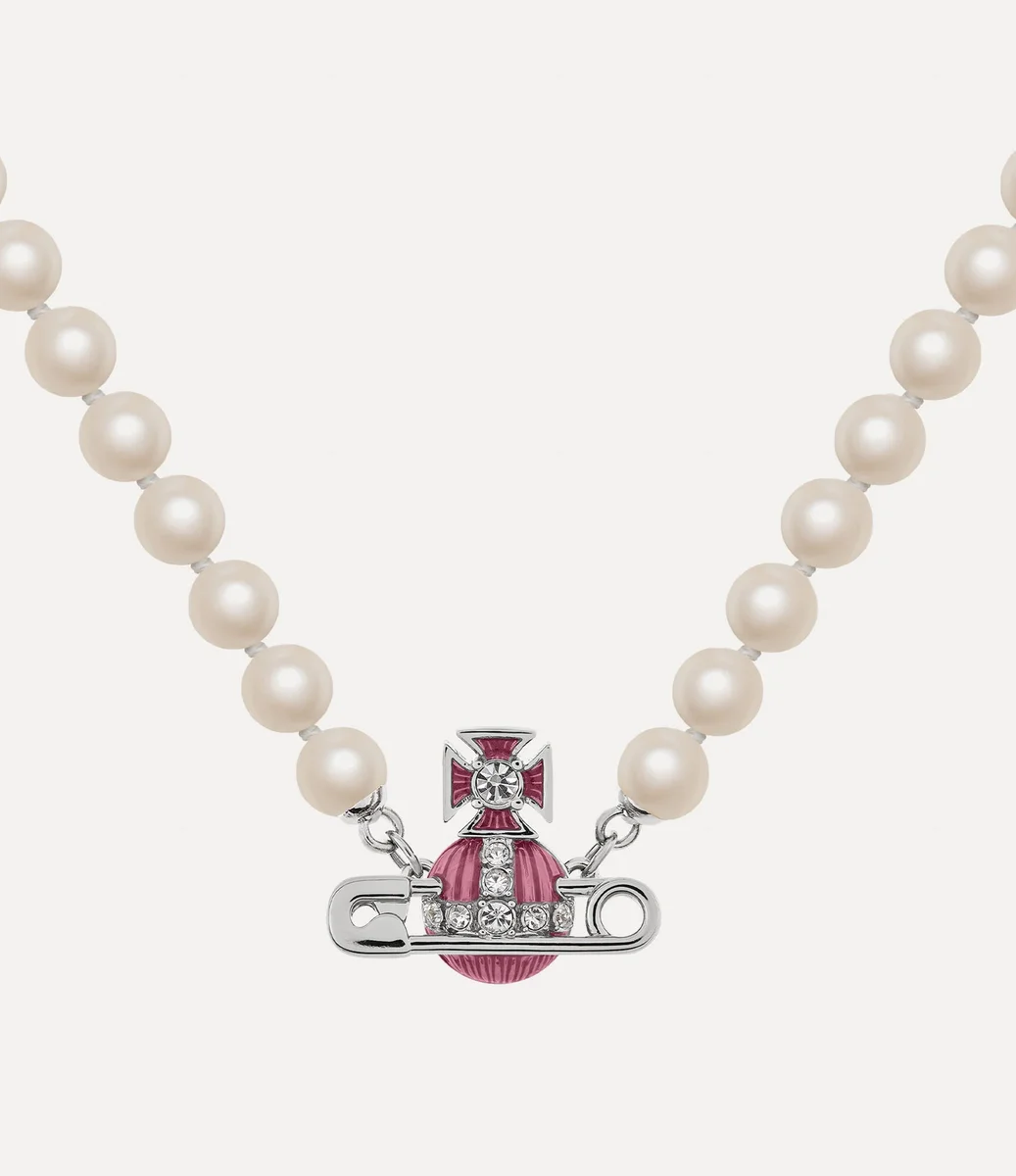Die Vivienne Westwood Kitty Pearl Halskette besteht aus handgeknüpften Glasperlen, einem Sicherheitsnadel-Motiv und einer rosenfarbenen Emaille-Kugel und ist mit einer silberfarbenen Beschichtung versehen.