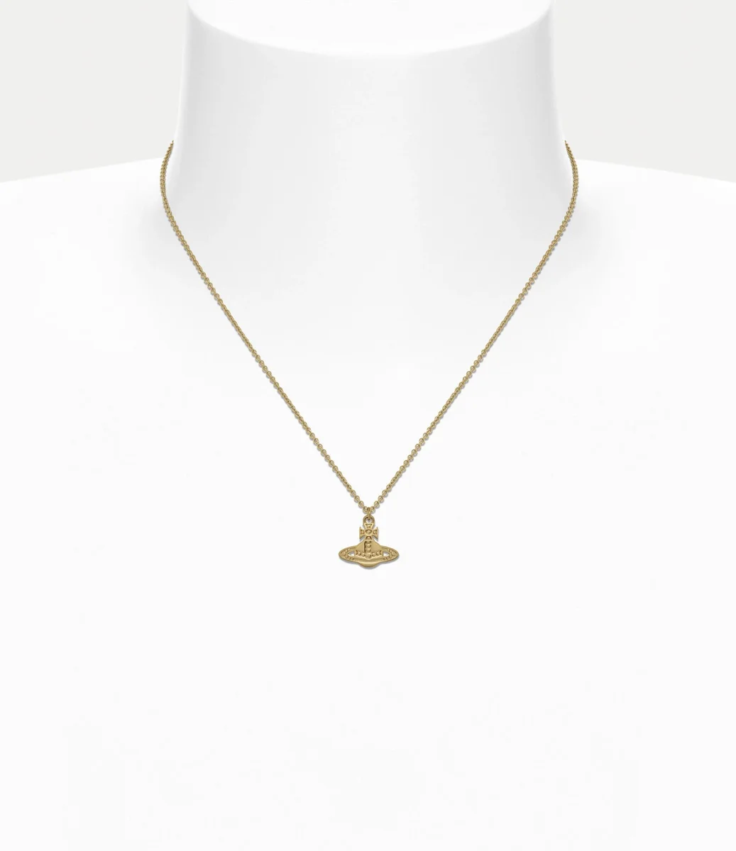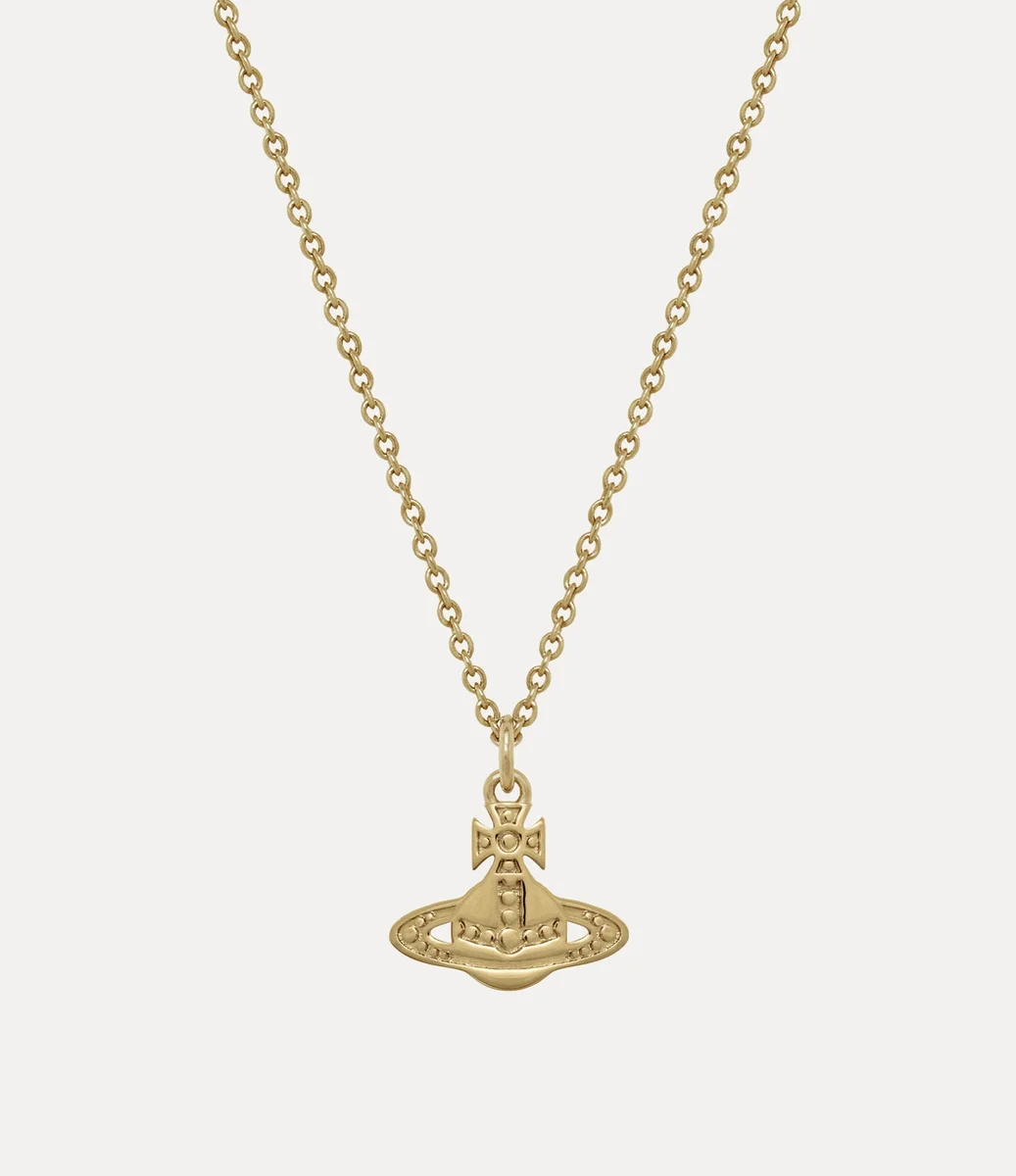 Unsere Marinetta-Anhänger-Halskette ist aus goldfarbenem Metall gefertigt und zeigt das klassische Kugelmotiv des Hauses. Der Anhänger hat eine sanft geprägte, perlenartige Textur, die einen handgefertigten Eindruck vermittelt, während gravierte Details die Konturen des Kreuzes und des Saturnrings hervorheben.