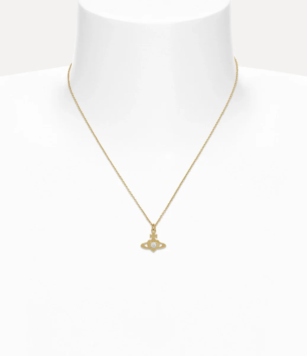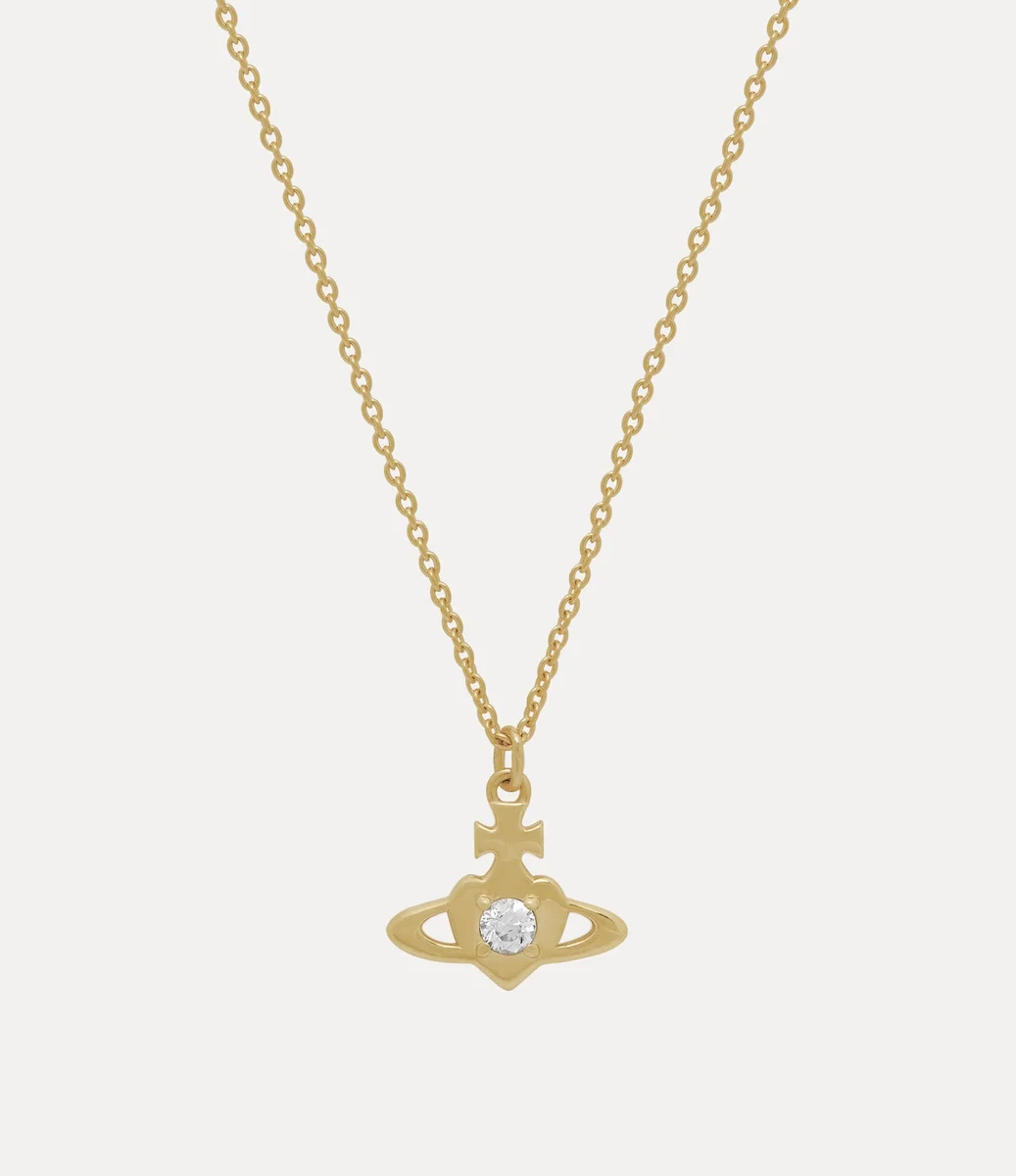 Unsere Noella-Halskette mit Anhänger hat eine goldfarbene Oberfläche und ist mit einem Herz-Kugel-Motiv verziert, das an Viviennes Liebe zur Menschheit und zum Planeten erinnert. Das aus recyceltem Silber gefertigte Schmuckstück ist in der Mitte mit einem weißen Kristall besetzt.