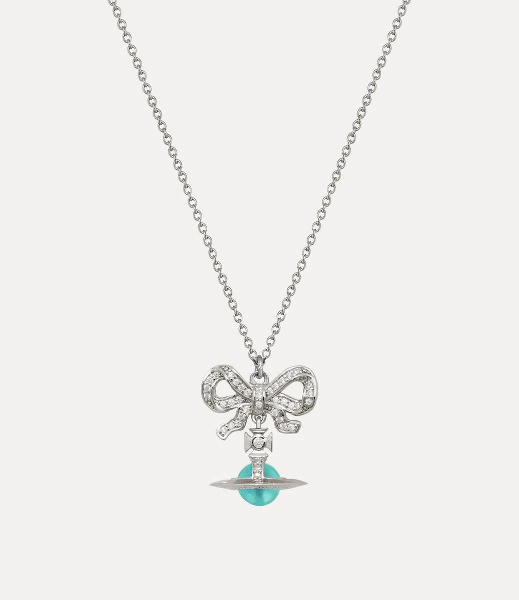 Unsere Octavie-Anhänger-Halskette ist aus recyceltem Silber gefertigt und mit einer polierten platinfarbenen Beschichtung versehen. Das mit funkelnden weißen Kristallen verzierte Design kombiniert eine Schleife im georgianischen Stil mit unserem charakteristischen dreidimensionalen Orb in der Mitte, der in Türkis gehalten ist und das klassische Orb-Motiv des Hauses widerspiegelt.