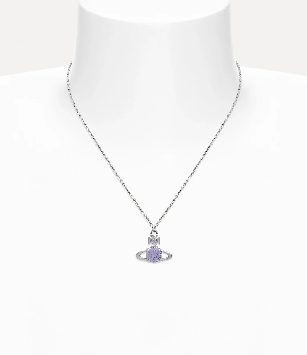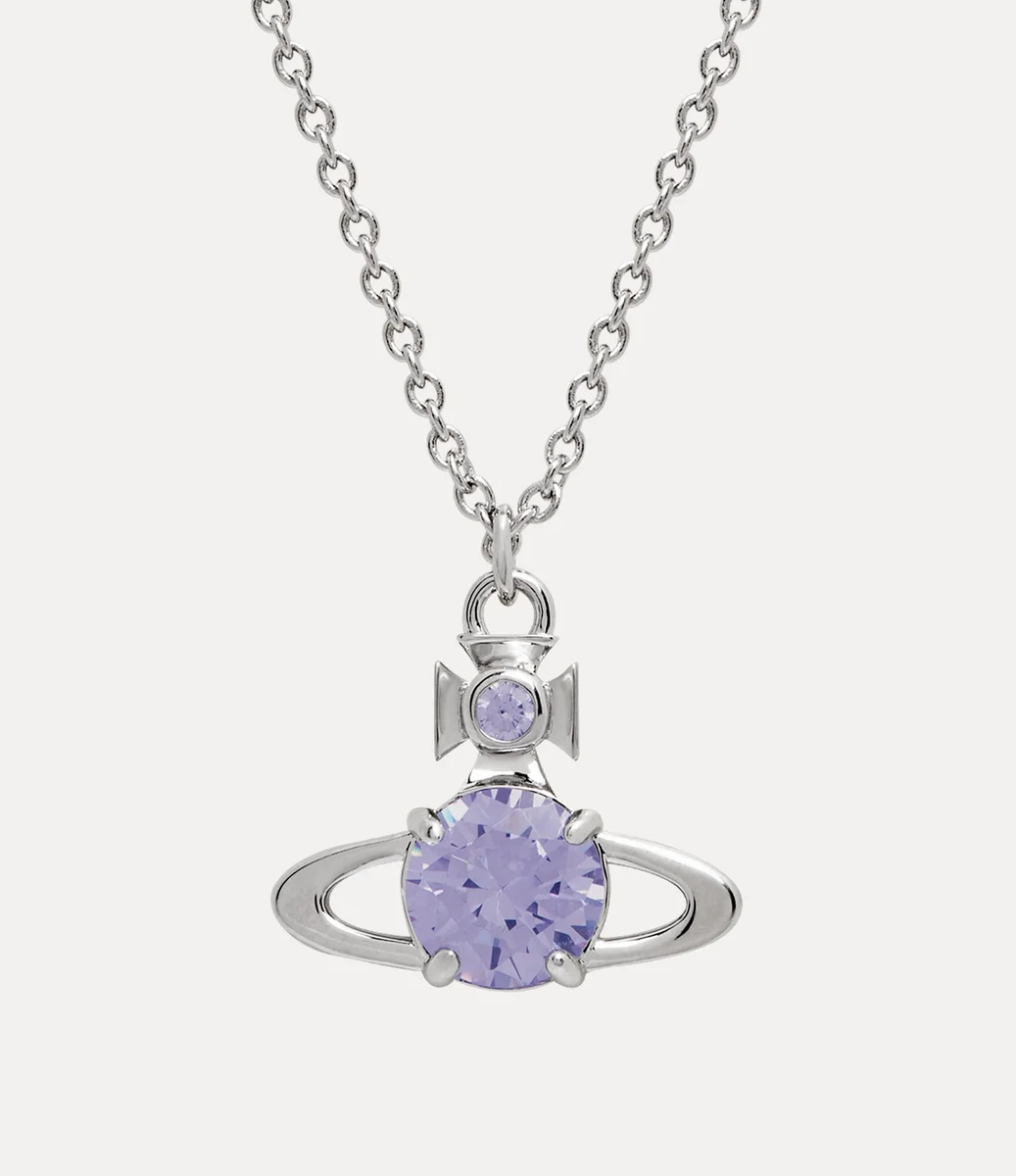 Die große Reina-Anhänger-Halskette von Vivienne Westwood in silberfarbener Beschichtung zeichnet sich durch die klassische zweidimensionale Kugelform aus, die mit helllavendelfarbenen Kristallen besetzt ist.