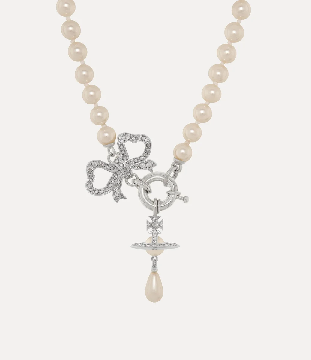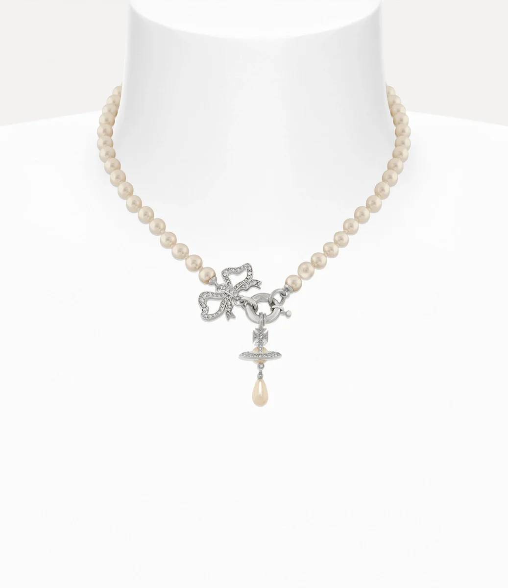 Die Rigoberta Pearl Halskette, das neueste Design der Rigoberta-Kollektion, verfügt über eine Reihe von Swarovski-Glasperlen und einen aufwendigen, georgianisch inspirierten Bogenanhänger – ein ikonisches Element des Hauses. In der Mitte wird das dreidimensionale Kugelmotiv durch ein tropfenförmiges Perlendetail hervorgehoben und mit einem Federverschluss abgeschlossen.