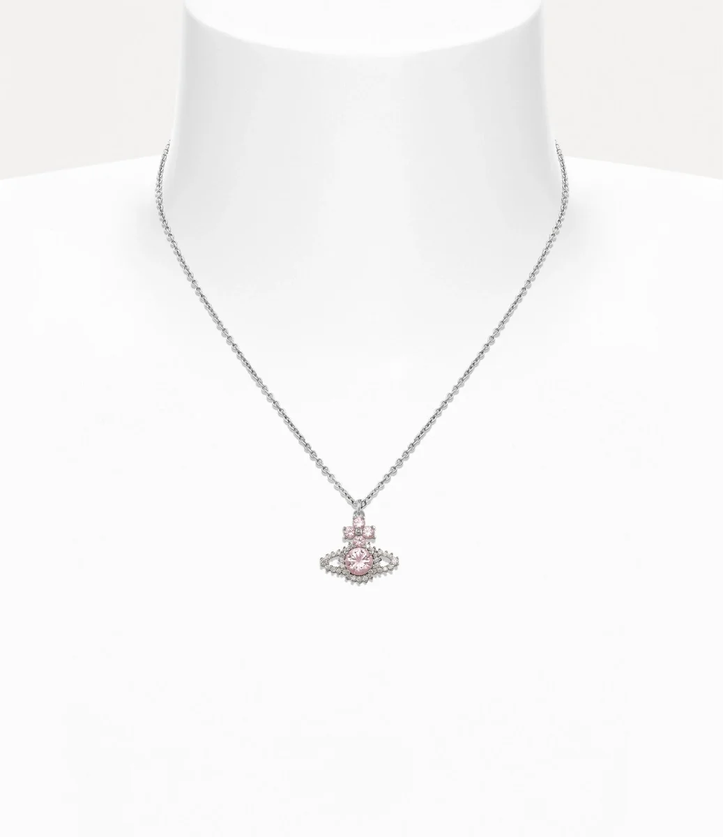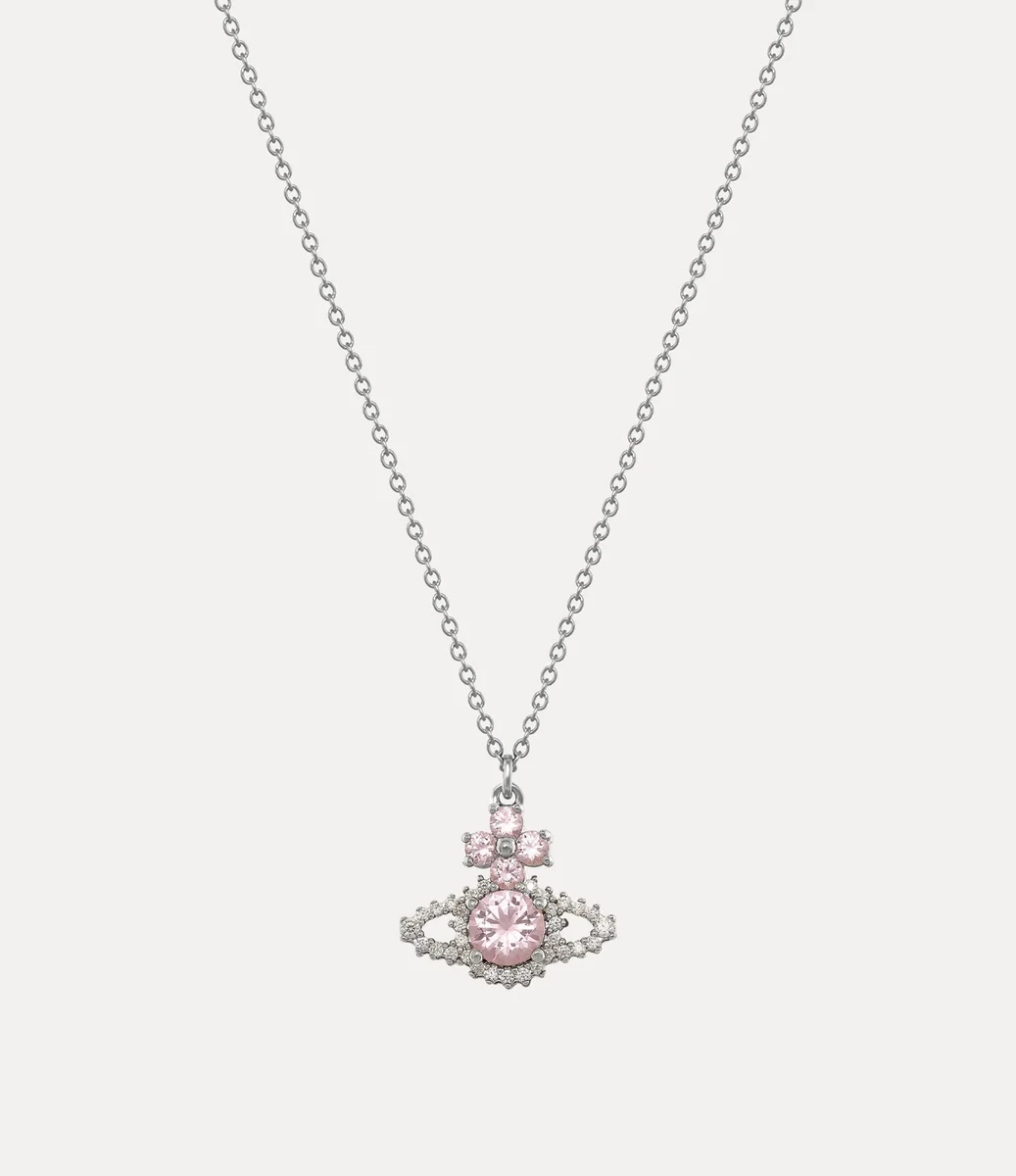Die Valentina Orb Halskette von Vivienne Westwood verfügt über eine kugelförmige Silhouette in der Mitte des Designs, die mit weißen und rosa Kristallakzenten verziert ist.