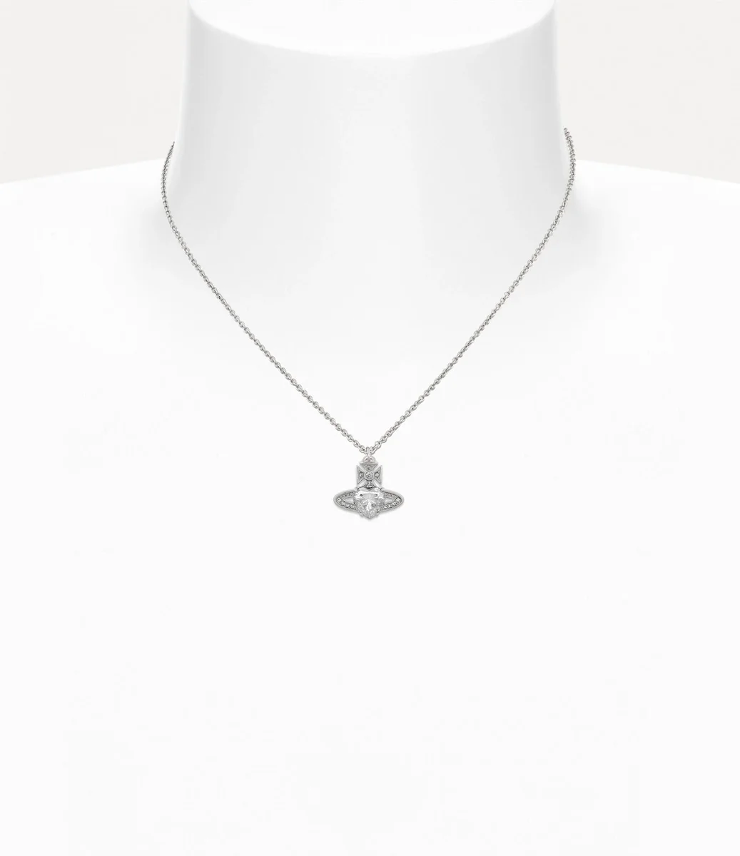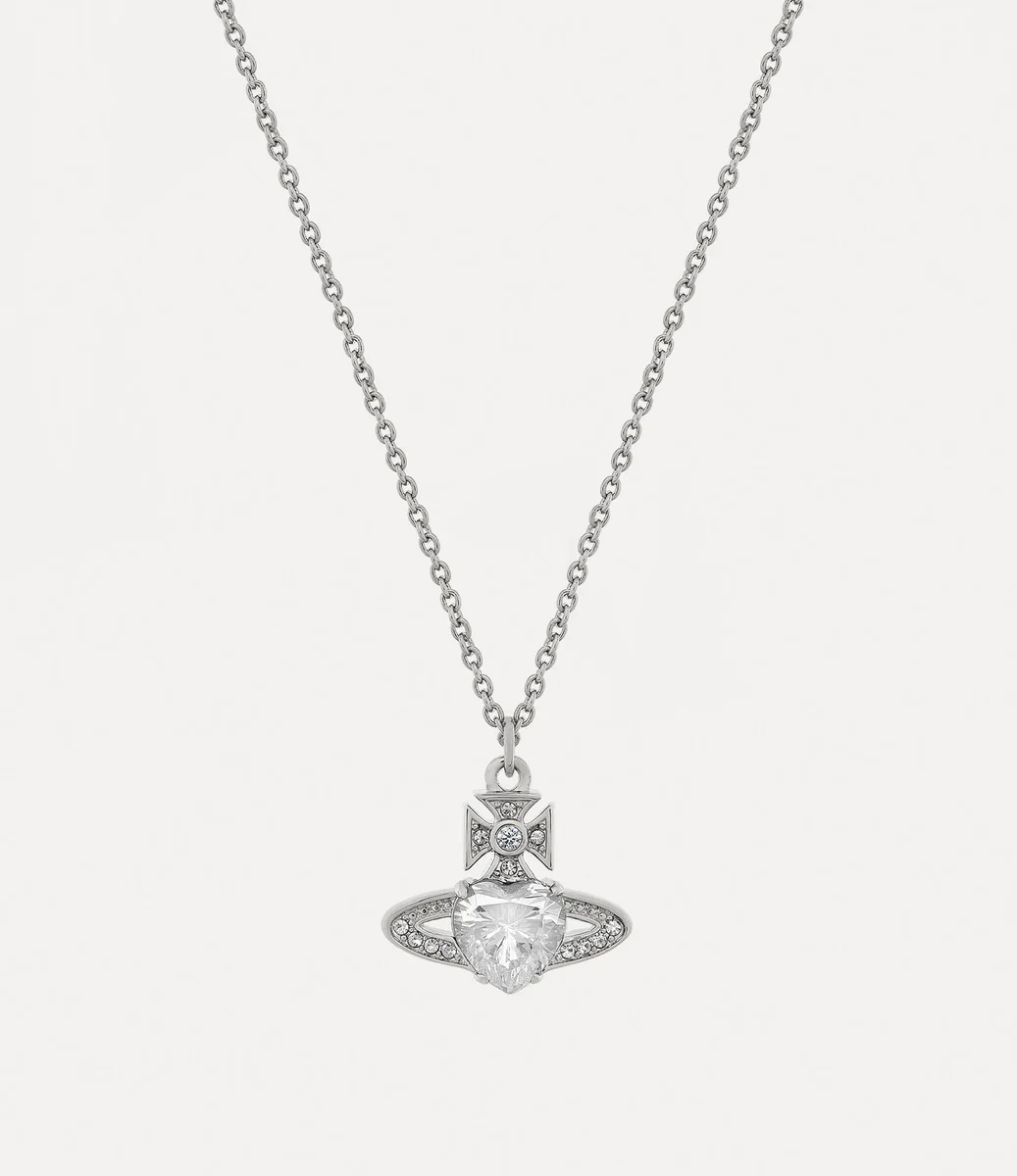 Die Vivienne Westwood Ariella Pendante Halskette verfügt über einen herzförmigen Edelstein in der Mitte des Designs, ergänzt durch einen mit Kristallen besetzten Saturnring.