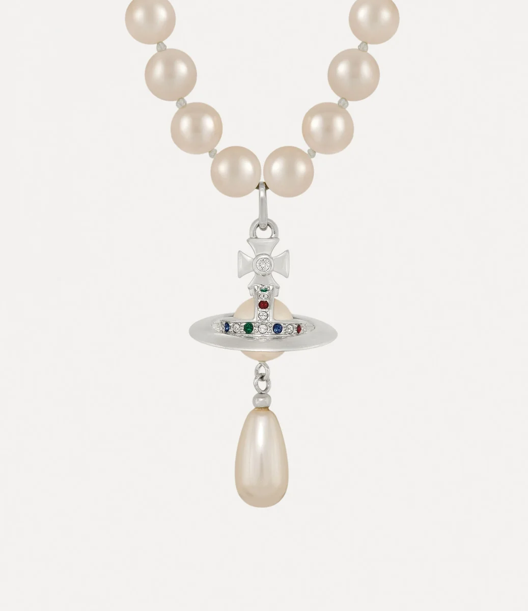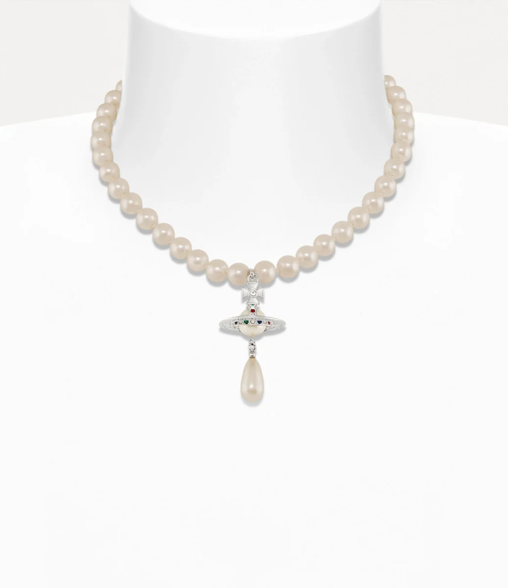 In den späten 1980er Jahren stellte Vivienne Westwood ihr ikonisches Perlenkonzept während der Harris Tweed Herbstmodenschau 1987 vor, bei der ein einreihiges Choker-Halsband präsentiert wurde. Unser einreihiges Perlen-Choker-Halsband spiegelt die elegante Form ihres ursprünglichen Designs wider und zeigt ein dreidimensionales Kugelmotiv, das mit Kristallakzenten und einem hängenden tropfenförmigen Perlen-Detail verziert ist.