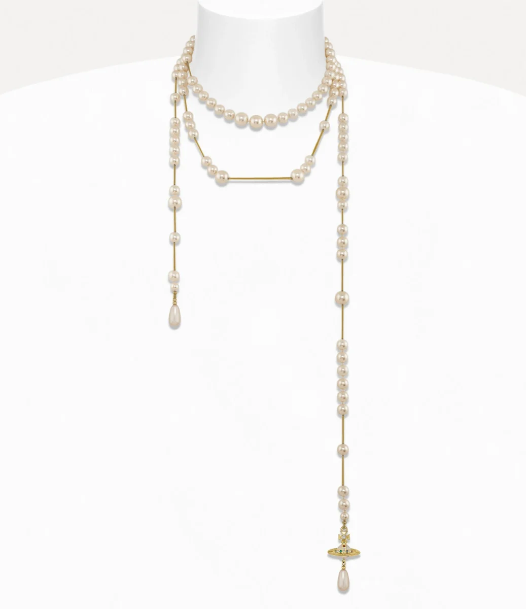 Perlen sind ein wesentliches Element der Ikonografie des Hauses und vermitteln ein Gefühl von Grandezza und Luxus. Die Broken Pearl Halskette wurde erstmals in der Kollektion „Storm in a Teacup” für Herbst/Winter 1996-97 vorgestellt, inspiriert von den dekorativen Elementen der Rokoko-Kunst. Dieses Stück besteht aus Glasperlen mit Viviennes charakteristischen „Broken”-Elementen und wurde für Frauen entworfen, die sich „dem Schrecken der Uniformität und des Minimalismus stellen”.