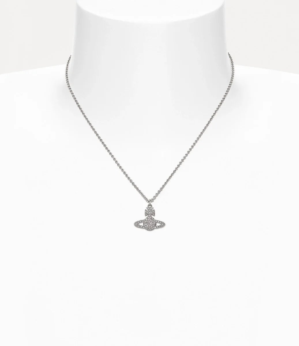 Die Grace Bas Relief Anhänger-Halskette ist eine Hommage an Viviennes Vision, Tradition in die Zukunft zu übertragen, und verfügt über ein zweidimensionales Kugelmotiv in der Mitte des Designs. Das Stück bietet eine Oberfläche aus weißen Kristallen, die die Silhouette verzieren, ergänzt durch eine polierte, silberfarbene Beschichtung.