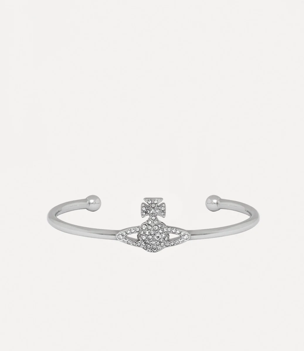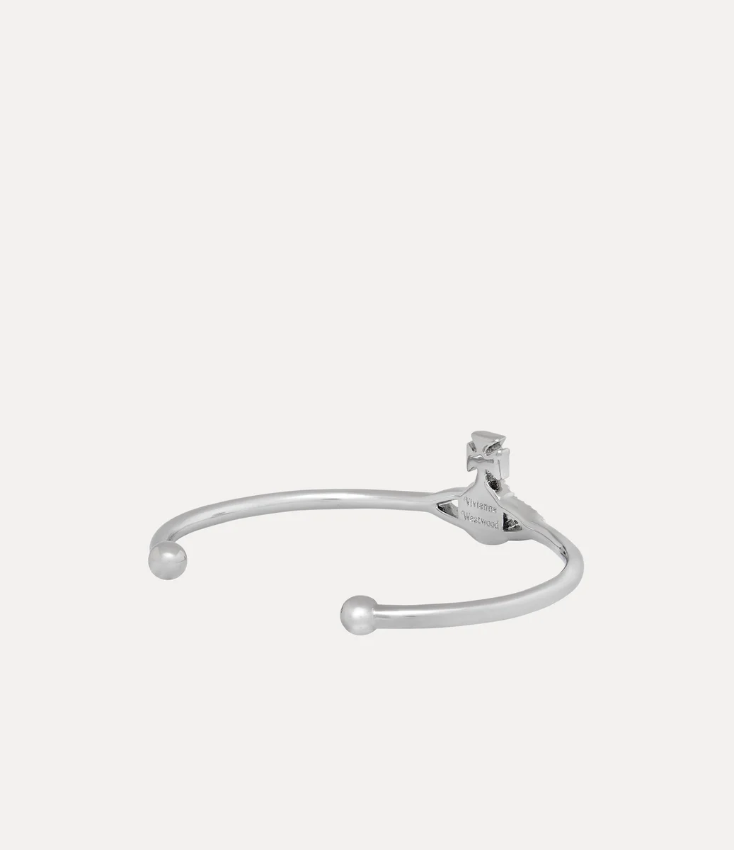 Unser Grace Bas Relief Open Armreif verfügt über ein Relief-Kugelmotiv in der Mitte des Designs, das mit pavé-gefassten weißen Kristallen verziert ist. Das Stück mit offener Manschette steht für Viviennes Ethos, die Vergangenheit in die Zukunft zu übertragen.