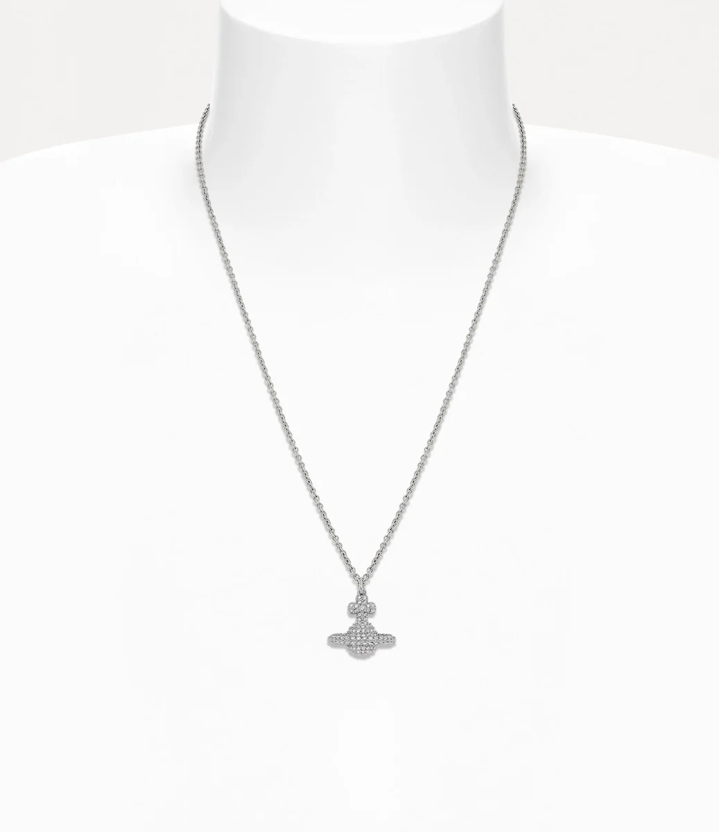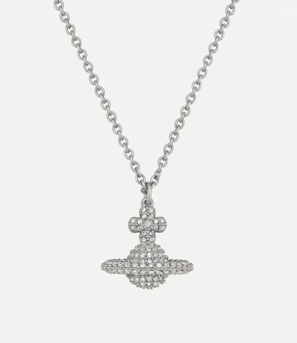 Als Hommage an Viviennes Vision, Tradition in die Zukunft zu tragen, ziert die Grace Small Pendant Halskette ein dreidimensionales Kugelmotiv in der Mitte des Designs. Das Schmuckstück ist mit weißen Kristallen verziert, die die Silhouette schmücken, und mit einer polierten, silberfarbenen Beschichtung versehen.