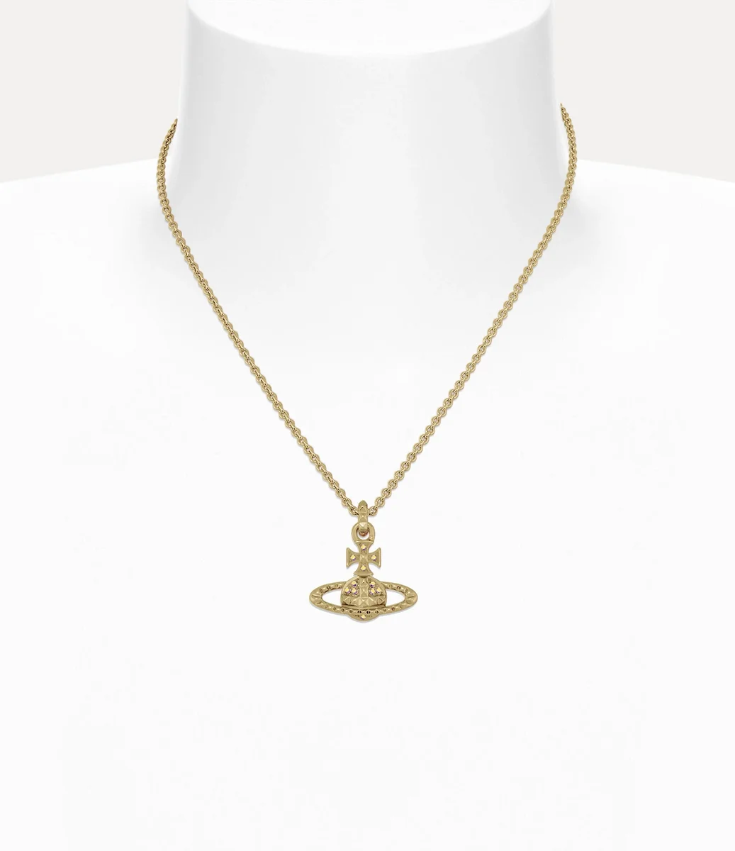 Die Mayfair Bas Relief Halskette kehrt in dieser Saison mit goldfarbener Beschichtung und glitzernden, schillernden Kristallverzierungen zurück. Das Schmuckstück zeichnet sich durch eine kugelförmige Silhouette aus, die für die Vision des Hauses steht, Tradition in die Zukunft zu tragen, ergänzt durch Nietenverzierungen, Symbole der Nonkonformität – ganz im Sinne von Viviennes charakteristischem Punk-Ansatz.