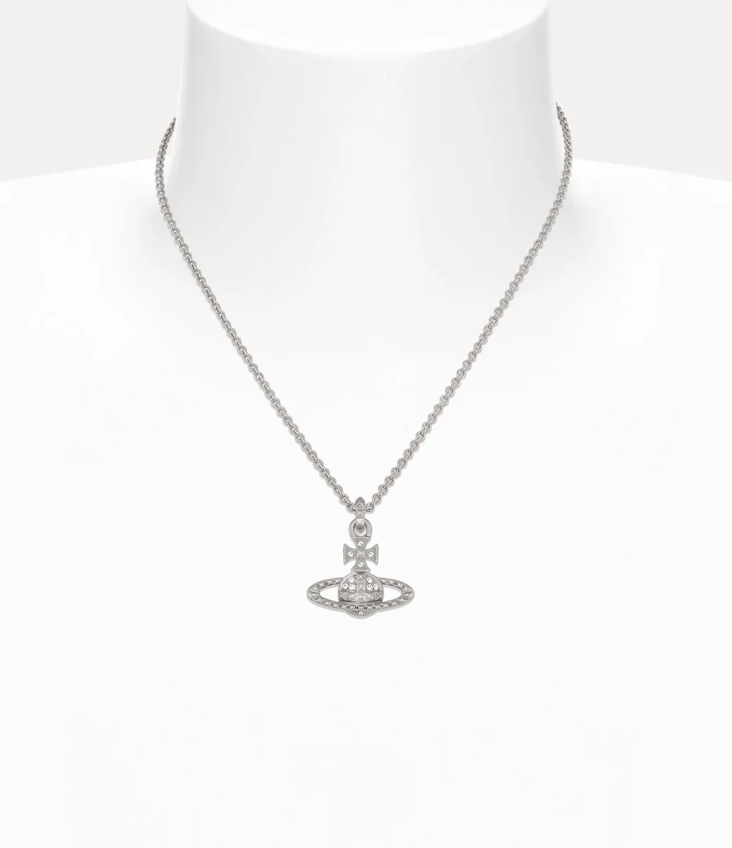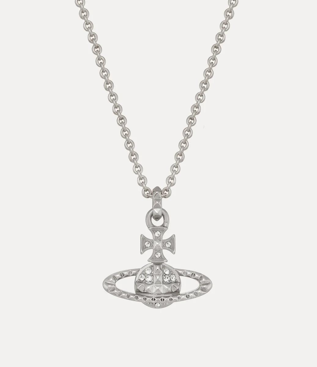 Die Mayfair Bas Relief Pendant Halskette kehrt in dieser Saison mit silberfarbener Beschichtung und glitzernden Kristallverzierungen zurück. Das Stück zeichnet sich durch eine kugelförmige Silhouette aus, die für die Vision des Hauses steht, Tradition in die Zukunft zu tragen, ergänzt durch Nietenverzierungen, Symbole der Nonkonformität – ganz im Sinne von Viviennes charakteristischem Punk-Ansatz.