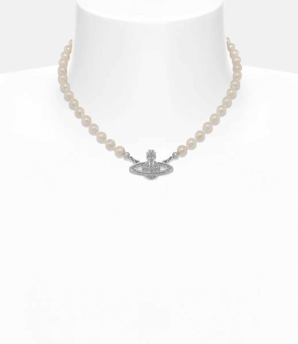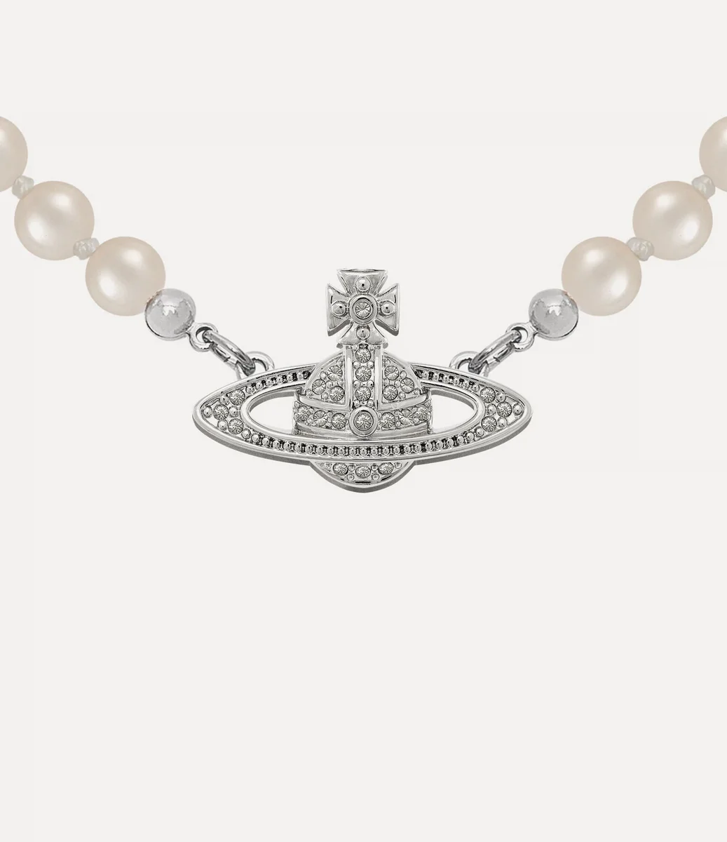 Ende der 1980er Jahre stellte Vivienne Westwood ihr ikonisches Perlenkonzept auf der Harris Tweed Herbstmodenschau 1987 vor, bei der ein einreihiges Halsband präsentiert wurde. Unser Mini Bas Relief Pearl Choker ist von diesem ursprünglichen Design inspiriert und wurde mit dem klassischen Orb-Motiv in der Mitte neu interpretiert, das durch glitzernde Kristalle ergänzt wird – eine Anspielung auf die Philosophie des Hauses, Vergangenheit und Zukunft miteinander zu verbinden.