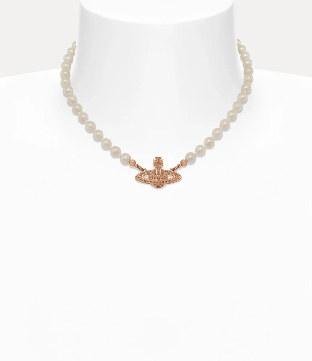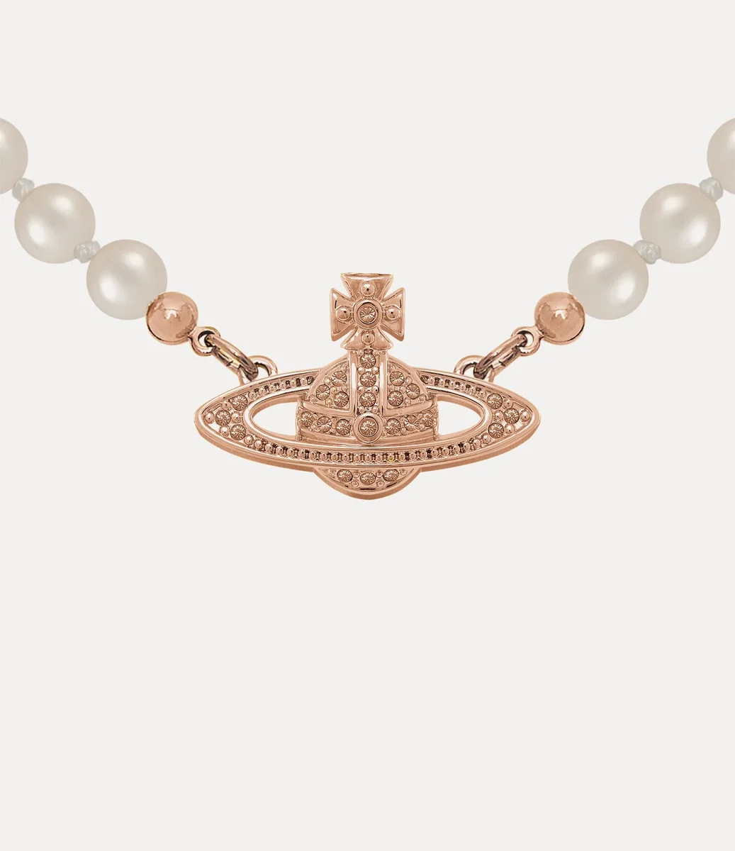 Ende der 1980er Jahre stellte Vivienne Westwood ihr ikonisches Perlenkonzept auf der Harris Tweed Herbstmodenschau 1987 vor, bei der ein einreihiges Halsband präsentiert wurde. Unser Mini Bas Relief Pearl Choker ist von diesem ursprünglichen Design inspiriert und wurde mit dem klassischen Kugelmotiv in der Mitte neu interpretiert, das durch glitzernde Kristalle ergänzt wird – eine Anspielung auf die Philosophie des Hauses, Vergangenheit und Zukunft miteinander zu verbinden.
