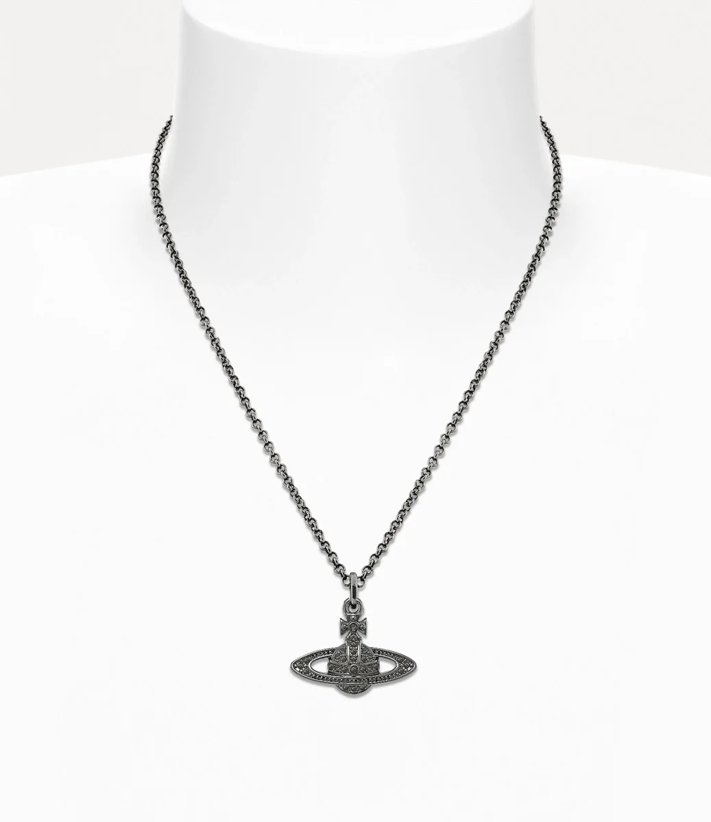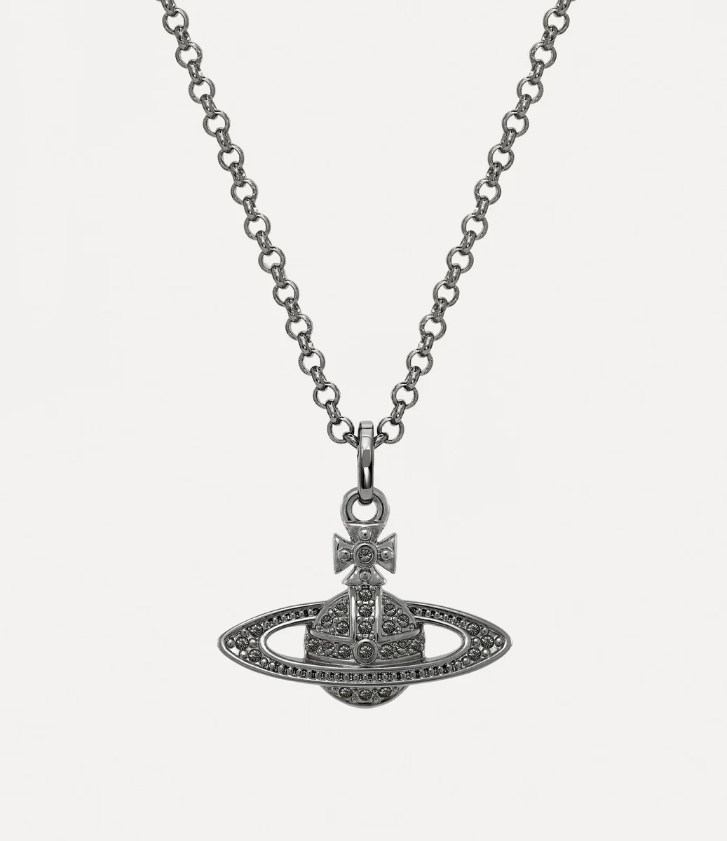 Die Mini-Basrelief-Anhänger-Halskette von Vivienne Westwood verfügt über eine mit Kristallen besetzte Kugel in der Mitte des Designs und einen klassischen Karabinerverschluss.