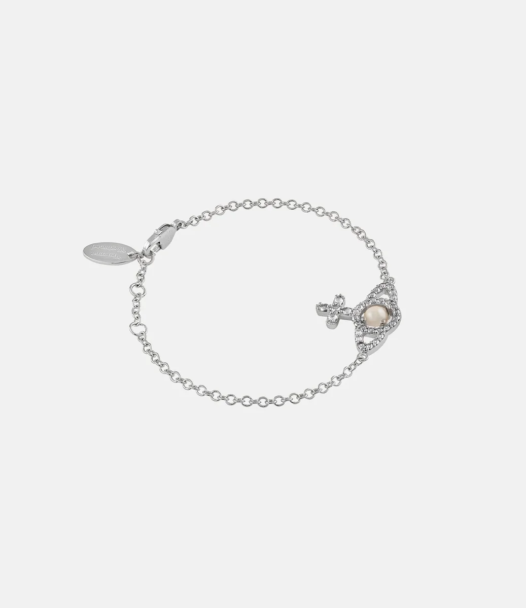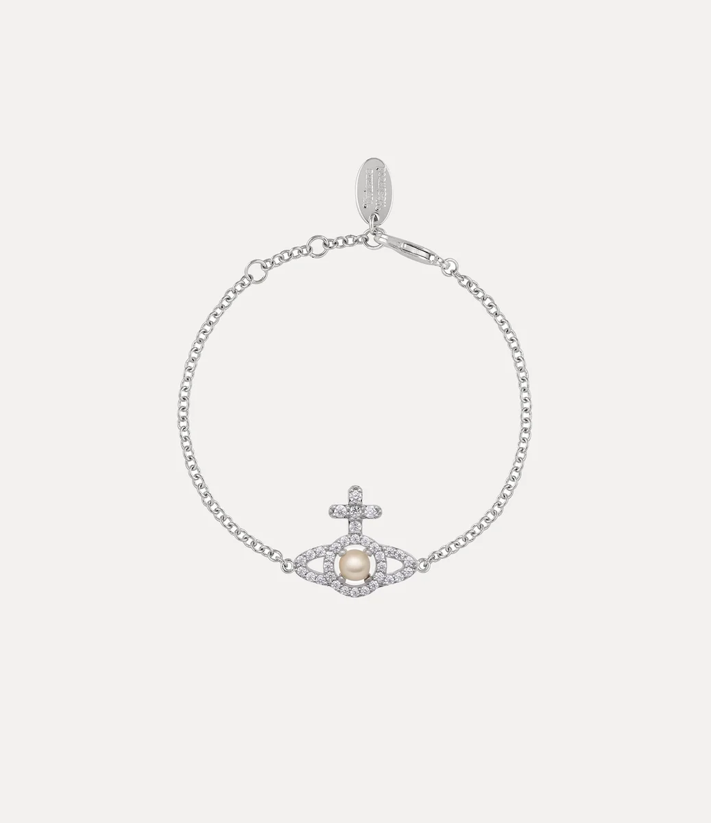 Der Kugelanhänger des Olympia Pearl Chain Armbands verkörpert Viviennes Vision, Tradition in die Zukunft zu tragen. Das ikonische Kugeldesign wird durch weiße Kristalldetails akzentuiert und durch eine glitzernde Glasperle in der Mitte des Schmuckstücks ergänzt.